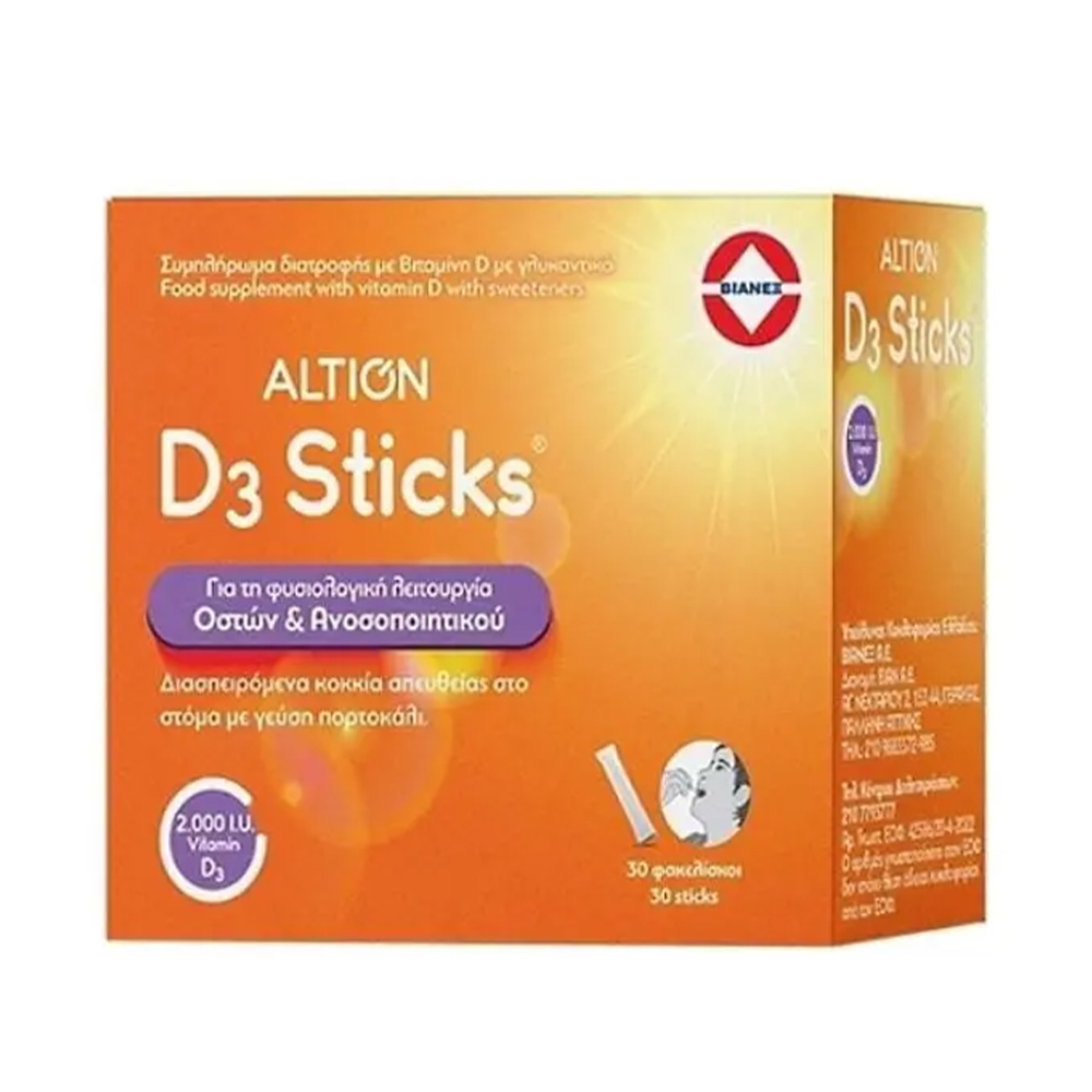 Το Altion D3 2000 IU sticks είναι ένα συμπλήρωμα διατροφής που περιέχει την ενεργή μορφή της βιταμίνης D3 (χοληκαλσιφερόλη) για την υγεία των οστών και την ενίσχυση του ανοσοποιητικού, σε μορφή διασπειρόμενων στο στόμα κοκκίων.
