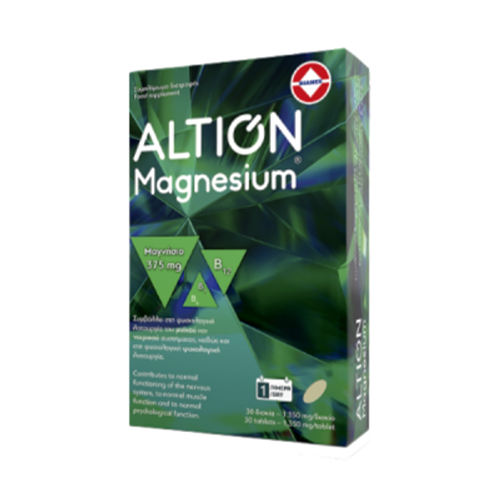 Το Altion Magnesium είναι ένα διατροφικό συμπλήρωμα με μαγνήσιο και βιταμίνες Β1, Β6, Β12. Με 1 ταμπλέτα ημερησίως καλύπτονται οι καθημερινές ανάγκες ενώ διατηρείται η υγεία του νευρικού και μυϊκού συστήματος καθώς και η φυσιολογική ψυχολογική λειτουργία.