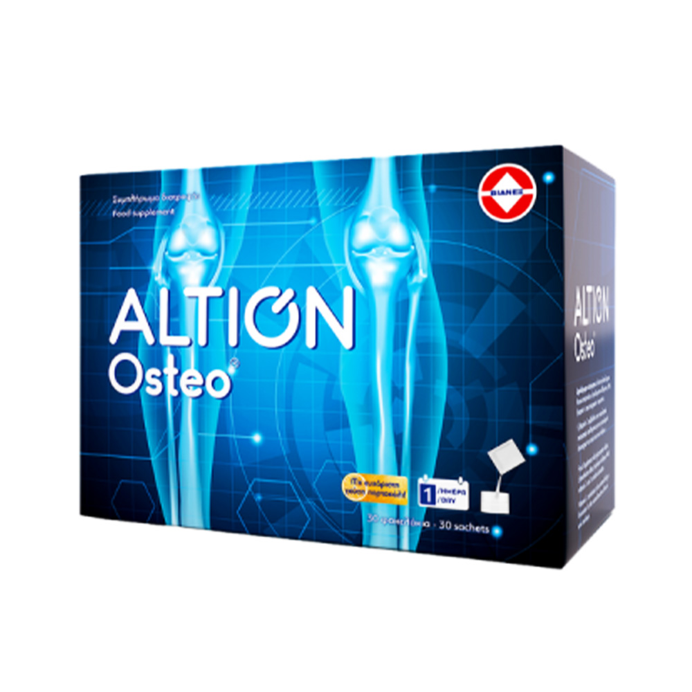 Το Altion Osteo είναι ένα κλινικά μελετημένο συμπλήρωμα διατροφής για την υγεία των αρθρώσεων και την οστεοαρθρίτιδα που περιέχει θειική γλυκοζαμίνη, θειική χονδροϊτίνη, υδρολυμένο κολλαγόνο, μεθυλοσουλφονυλομεθάνιο (MSM), βιταμίνη C και L-καρνιτίνη.