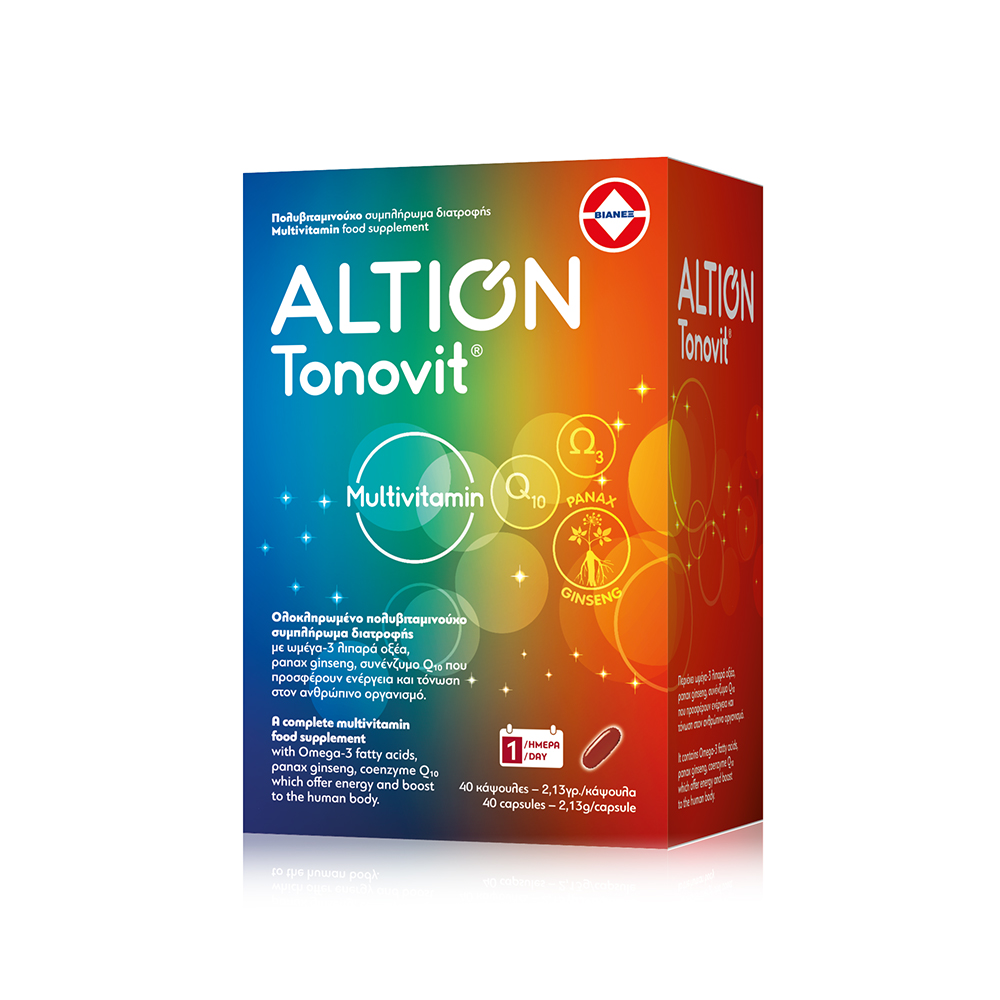 Η Altion Tonovit Multivitamin είναι μια πολυβιταμίνη που παρέχει άμεση τόνωση και ενέργεια, καθώς και πλήρη κάλυψη των διατροφικών κενών των ενηλίκων. Περιέχει όλες τις απαραίτητες βιταμίνες, μέταλλα, ιχνοστοιχεία και επιπλέον συνένζυμο Q10 και ginseng αλλά και ωμέγα 3 λιπαρά οξέα. Είναι κατάλληλο για * :