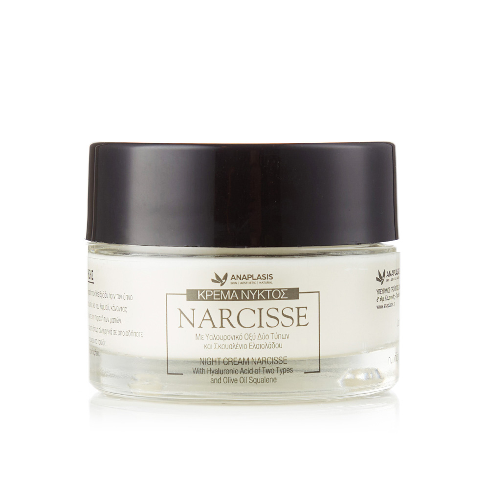 Η κρέμα νυκτός “Narcisse – Με Υαλουρονικό Οξύ Δύο Τύπων και Σκουαλένιο Ελαιολάδου” της εταιρίας αναPLASIS ενυδατώνει, προστατεύει από την απώλεια της φυσικής υγρασίας και επαναφέρει την ελαστικότητα στην επιδερμίδα. Ταυτόχρονα θρέφει το δέρμα, βοηθώντας στη διατήρηση της ελαστικότητας και της σφριγηλότητάς του.