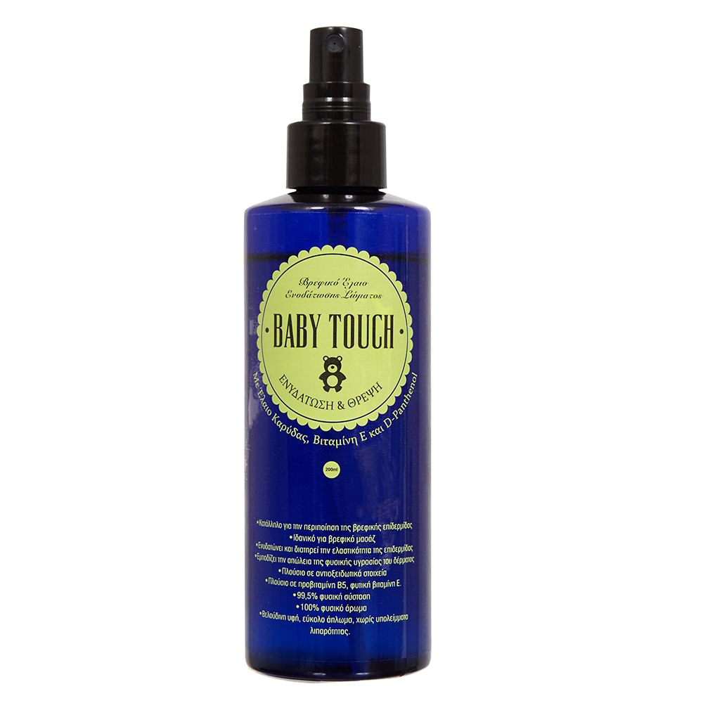 Το Έλαιο Ενυδάτωσης Σώματος – “Baby Touch” – Με Έλαιο Καρύδας, Βιταμίνη Ε και D-Panthenol, χάρη στη φυσική σύνθεσή του, είναι ιδανικό για βρεφικό μασάζ. Απλώνεται εύκολα, χωρίς να αφήνει λιπαρότητα και χαρίζει στο δέρμα του μωρού σας βελούδινη αίσθηση και απαλότητα. Με απαλό, 100% φυσικό άρωμα.