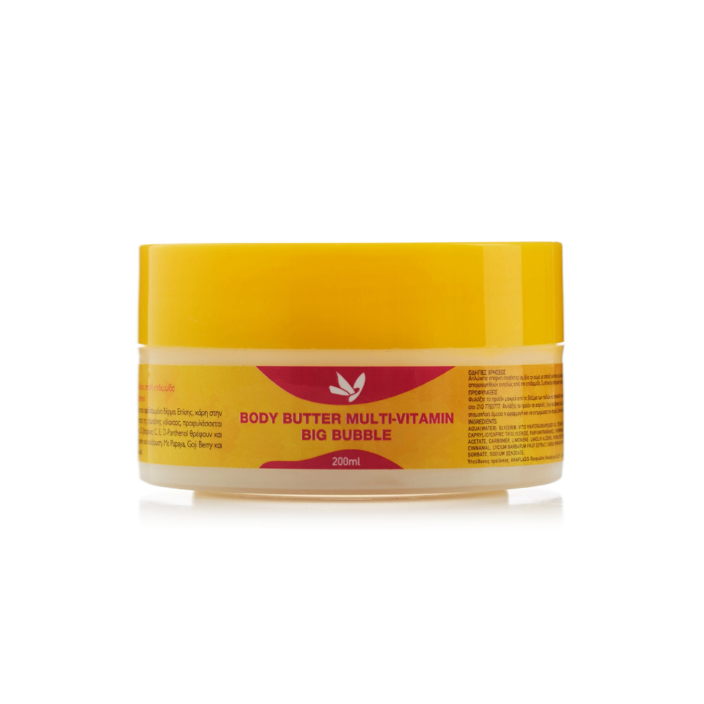 Το Body Butter Multi-Vitamin Big Bubble χαρίζει άμεση και διαρκή ενυδάτωση στο αφυδατωμένο δέρμα. Επίσης, χάρη στην πλούσια υφή που δίνουν τα βούτυρα Κακάο και Καριτέ, καθώς και στις ιδιότητες της πρωτεΐνης γάλακτος, προφυλάσσεται το υδρολιπιδικό φιλμ της επιδερμίδας και αποτρέπεται η απώλεια υγρασίας. Οι βιταμίνες C, E, D-Panthenol θρέφουν και χαρίζουν αντιοξειδωτική προστασία, προστατεύοντας από την πρόωρη γήρανση και χαλάρωση. Με Papaya, Goji Berry και Macadamia, για ανανέωση, ενδυνάμωση και σφριγηλότητα στην επιδερμίδα σας.