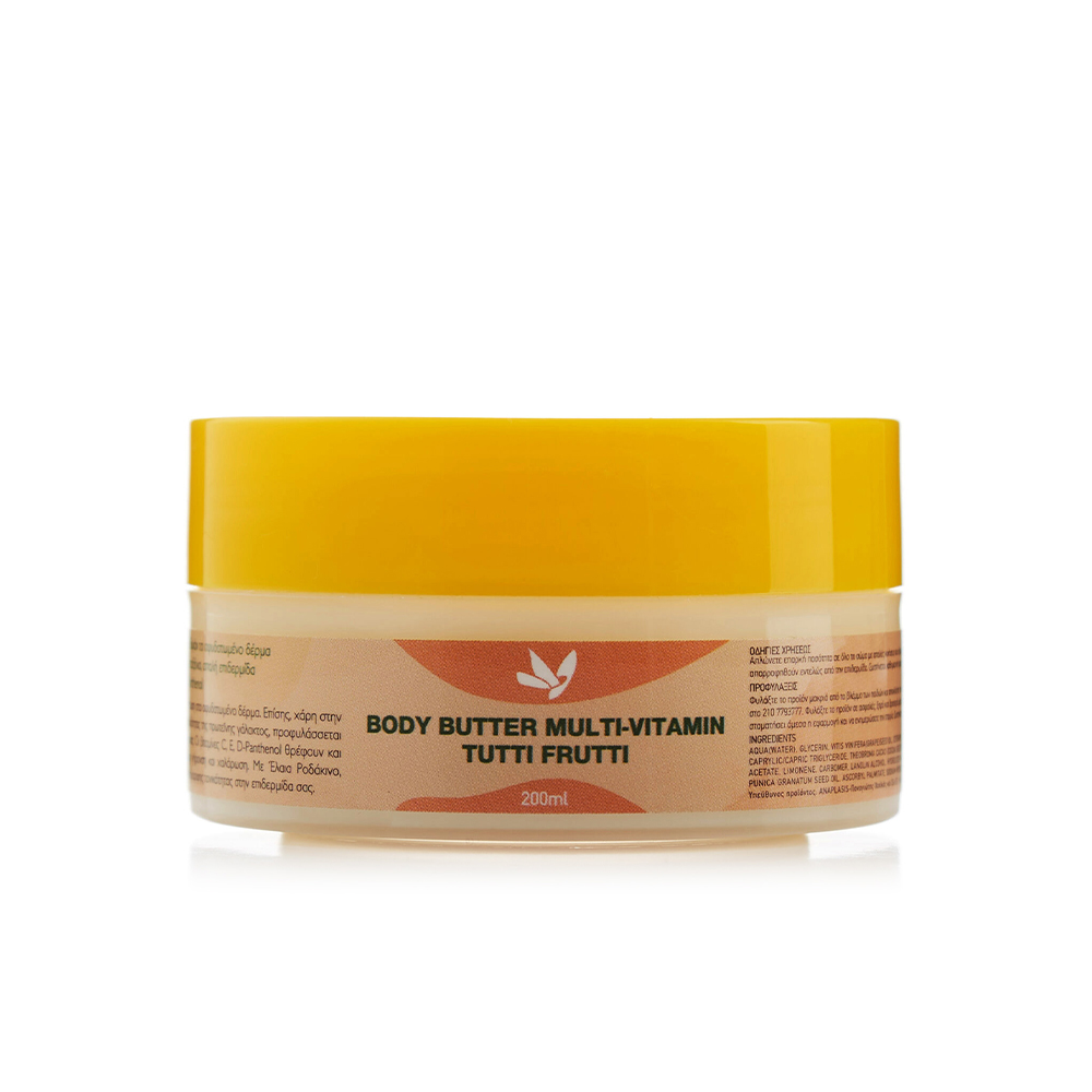 Το Body Butter Multi-Vitamin Tutti Frutti χαρίζει άμεση και διαρκή ενυδάτωση στο αφυδατωμένο δέρμα. Επίσης, χάρη στην πλούσια υφή που δίνουν τα βούτυρα Κακάο και Καριτέ, καθώς και στις ιδιότητες της πρωτεΐνης γάλακτος, προφυλάσσεται το υδρολιπιδικό φιλμ της επιδερμίδας και αποτρέπεται η απώλεια υγρασίας. Οι βιταμίνες C, E, D-Panthenol θρέφουν και χαρίζουν αντιοξειδωτική προστασία, προστατεύοντας από την πρόωρη γήρανση και χαλάρωση. Με Έλαια Ροδάκινο, Βερίκοκο και Ρόδι, χαρίζει φωτεινότητα και βοηθά στην επίτευξη πιο ομοιόμορφης τονικότητας στην επιδερμίδα σας.