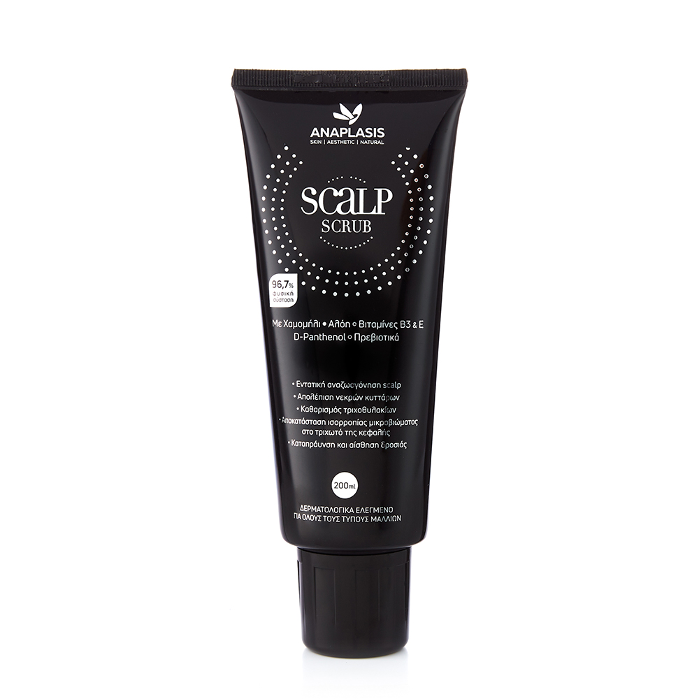 Το Scalp Scrub – Με Χαμομήλι, Αλόη, Βιταμίνες B3, E, D–Panthenol και Πρεβιοτικά της εταιρίας ANAPLASIS χάρη στα επιλεγμένα φυσικά συστατικά του, βοηθά στην εξυγίανση του τριχωτού της κεφαλής.