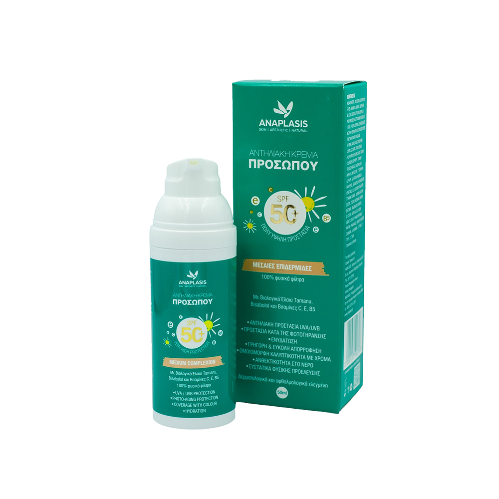 Η Αντηλιακή Κρέμα Προσώπου SPF50+ Για Μέτριες Επιδερμίδες – Με 100% Φυσικά Φίλτρα, Βιολογικό Έλαιο Tamanu, Bisabolol και Βιταμίνες C, E, B5 της εταιρίας ανάPLASIS, περιέχει επιλεγμένα ενεργά συστατικά, που προστατεύουν αποτελεσματικά και διατηρούν το δέρμα ενυδατωμένο κατά την έκθεση στον ήλιο.