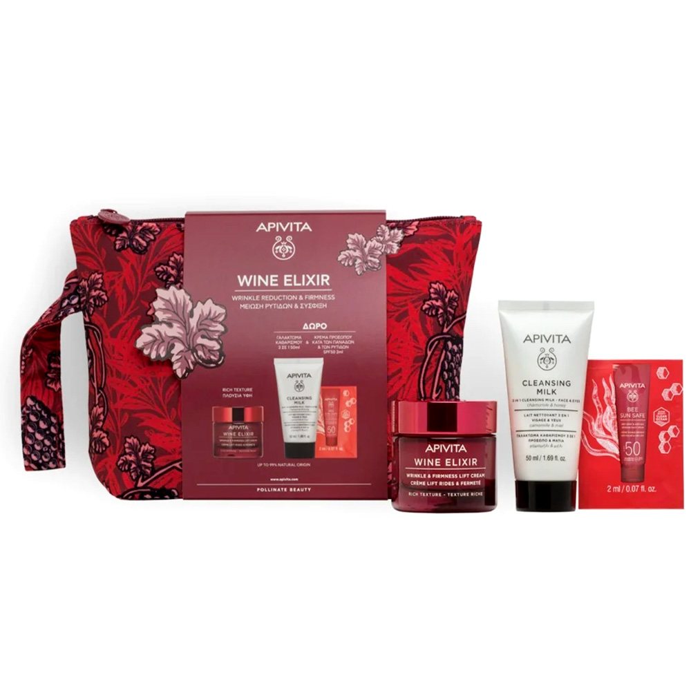 APIVITA PROMO WINE ELIXIR Wrinkle & Firmness Lift Cream (Rich) 50ml + ΔΩΡΟ Cleansing Milk Face & Eyes 50ml + Bee Sun Safe Anti-Spot & Anti-Age Defense Face Cream SPF50 2ml