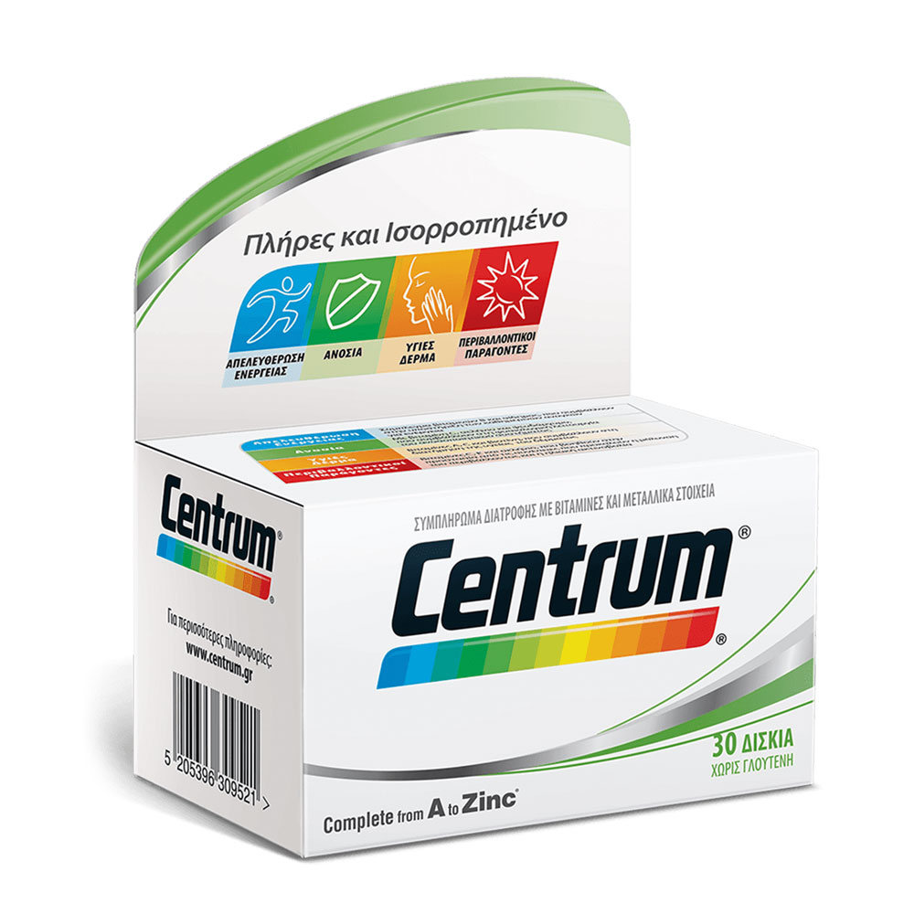 Ο οργανισμός μας χρειάζεται να προσλαμβάνει καθημερινά συγκεκριμένες ποσότητες βασικών βιταμινών, μετάλλων και ιχνοστοιχείων. Με λίγες εξαιρέσεις, αυτά τα θρεπτικά συστατικά δεν μπορούν να συντεθούν από τον ανθρώπινο οργανισμό ή παράγονται ανεπαρκώς. Για αυτό το λόγο, έχει αναπτυχθεί από τους ειδικούς μας το Centrum A to Zinc, ένα συμπλήρωμα διατροφής που βοηθά στην κάλυψη των καθημερινών αναγκών σε βιταμίνες και μεταλλικά στοιχεία. Εύκολο στη λήψη, όπου και όποτε το χρειαστείτε.