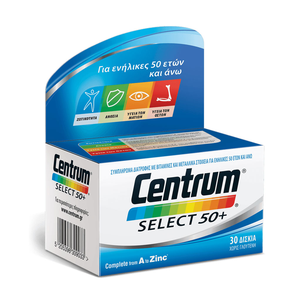 Τα άτομα ηλικίας 50 ετών και άνω έχουν αυξημένες ανάγκες σε θρεπτικά συστατικά. Για αυτό το λόγο, το Centrum Select 50+ είναι ένα συμπλήρωμα διατροφής με προσαρμοσμένα επίπεδα βιταμινών, μετάλλων και ιχνοστοιχείων, ώστε να ανταποκρίνεται σε αυτές τις ανάγκες.