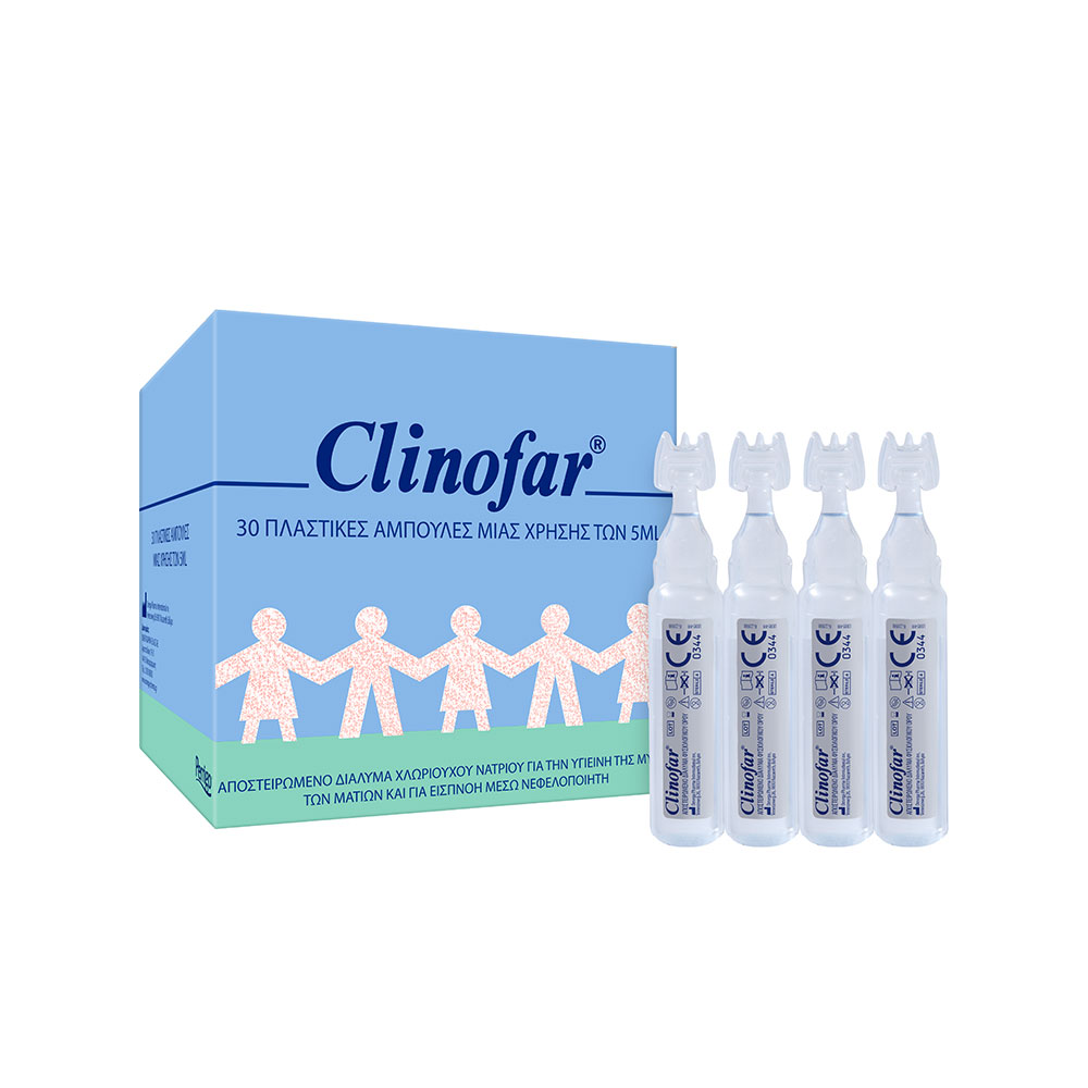 Οι ισότονες αμπούλες Clinofar® περιέχουν αποστειρωμένο, μη ενέσιμο διάλυμα φυσιολογικού ορού, χωρίς συντηρητικά και είναι ασφαλείς, υγιεινές και εύκολες στη χρήση. Είναι κατάλληλες για καθημερινή χρήση σε πολλαπλές ενδείξεις όπως καθαρισμός της μύτης, των ματιών, των αυτιών, των τραυμάτων καθώς και για εισπνοές σε θεραπείες αερολύματος. Σε πρακτική συσκευασία με αποσπώμενες αμπούλες μιας χρήσης, μπορείτε να τις έχετε πάντα και παντού μαζί σας και συστήνονται για όλη την οικογένεια (νεογέννητα, μωρά, παιδιά αλλά και ενήλικες).