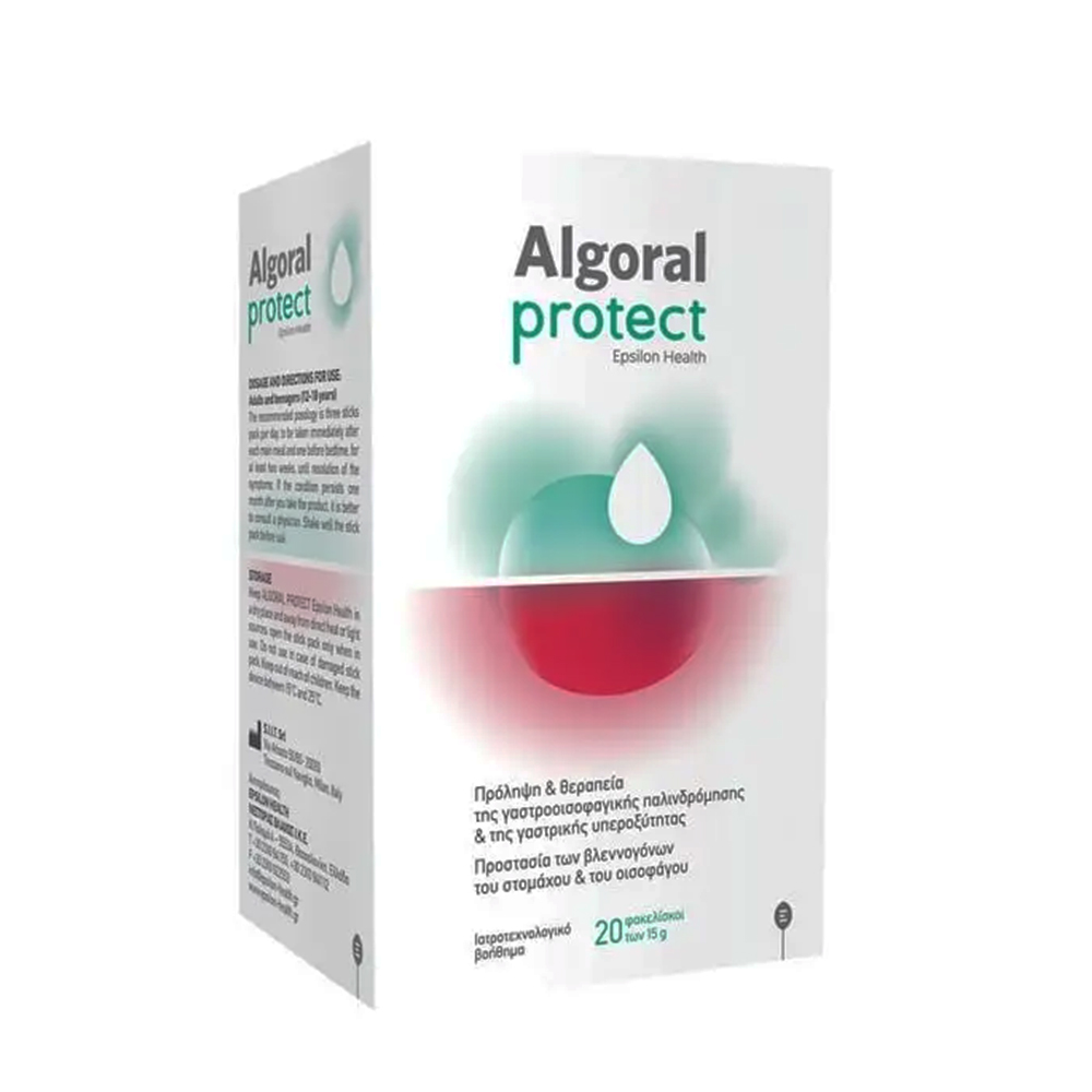 Το Epsilon Health Algoral Protect είναι ένα συμπλήρωμα διατροφής με αλγινικό νάτριο, ανθρακικό ασβέστιο και διττανθρακικό κάλιο που προσφέρει ανακούφιση και προστασία από τις καούρες, τη γαστρική υπεροξύτητα και τη γαστροοισοφαγική παλινδρόμηση.