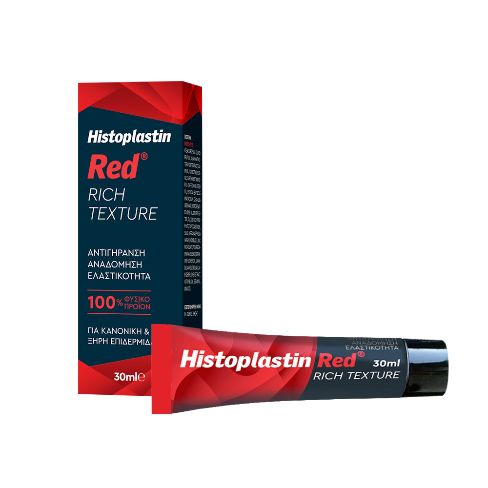 Η Histoplastin Red RICH TEXTURE είναι μια κρέμα με ισχυρές αναγεννητικές, αντιγηραντικές και αντιοξειδωτικές ιδιότητες. Προορίζεται για την εντατική περιποίηση της επιδερμίδας, την αναδόμηση και τη βελτίωση της όψης και της υφής της. Ανανεώνει το πρόσωπο, αναδεικνύοντας τη φυσική του ομορφιά. Περιέχει τον εξαιρετικά ισχυρό αναγεννητικό παράγοντα του δέρματος Alkannin Αctive σε συνεργιστική δράση με τερπένια από την ελαιορητίνη Pistacia Lentiscus και το Olea Europaea, ενώ είναι εμπλουτισμένη και με Αrgan oil.