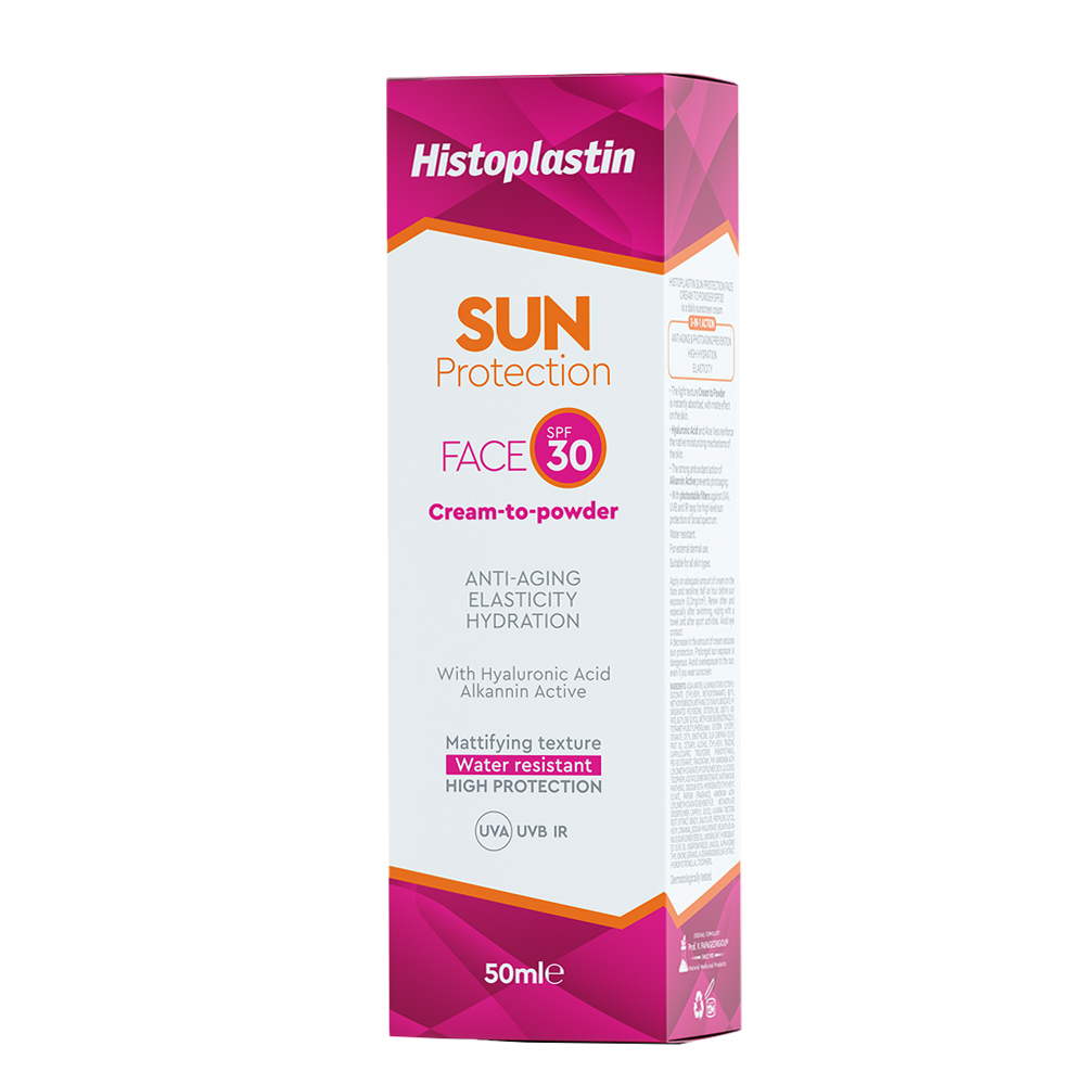 H Histoplastin SUN PROTECTION FACE CREAM TO POWDER SPF30 είναι αντηλιακή κρέμα προσώπου καθημερινής χρήσης. Βασίζεται στην τεχνολογία Alkannin Active Technology και προσφέρει τη νέα ολοκληρωμένη 360ᵒ αντηλιακή προστασία 3 σε 1.