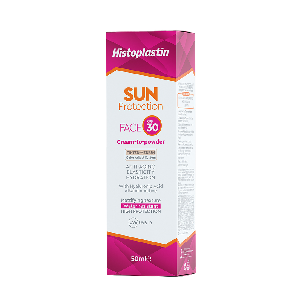 H Histoplastin SUN PROTECTION FACE CREAM TO POWDER TINTED SPF30 είναι αντηλιακή κρέμα προσώπου με χρώμα, καθημερινής χρήσης. Βασίζεται στην τεχνολογία Alkannin Active Technology και προσφέρει τη νέα ολοκληρωμένη 360ᵒ αντηλιακή προστασία 3 σε 1.