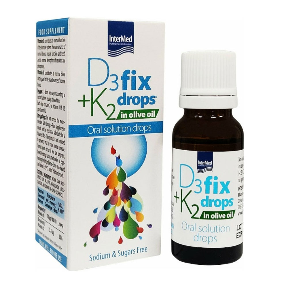 Το D3 Fix Drops & K2 in olive oil συμβάλει στην κάλυψη των αυξημένων απαιτήσεων του οργανισμού σε βιταμίνη D3 & K2, όταν υπάρχει ένδεια αυτών καθώς και ιδιαίτερη ανάγκη απορρόφησης υψηλών ποσοτήτων ασβεστίου και σωστής αξιοποίησης αυτού.