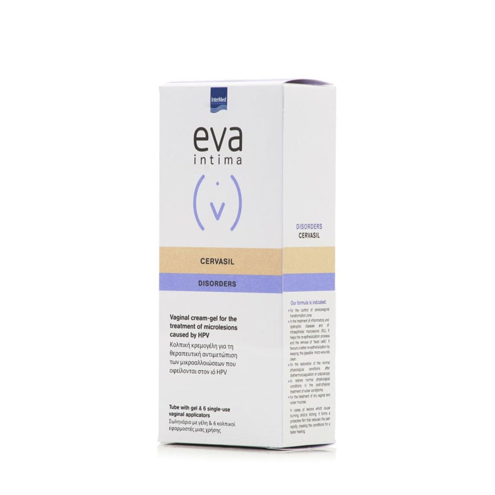 Η Intermed Eva Intima Cervasil Disorders είναι μία κολπική κρεμογέλη της οποίας η σύνθεση δημιουργεί έναν αμυντικό φραγμό ως επιπρόσθετη θεραπεία στην αντιμετώπιση των ενδοεπιθηλιακών αλλοιώσεων που προκαλούνται από τον ιό HPV βελτιώνοντας την διαδικασία επούλωσης του τραύματος.