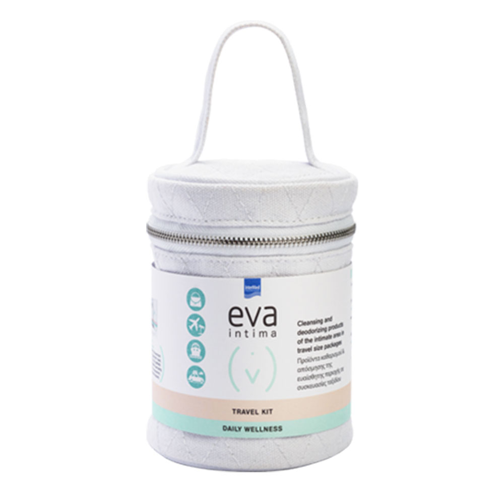 Το Eva Intima Travel Kit αποτελεί την πρακτική επιλογή για εύκολη μεταφορά των προϊόντων Eva Intima Daily Wellness σε συσκευασίες μεγέθους ταξιδίου σε υφασμάτινο νεσεσέρ.
