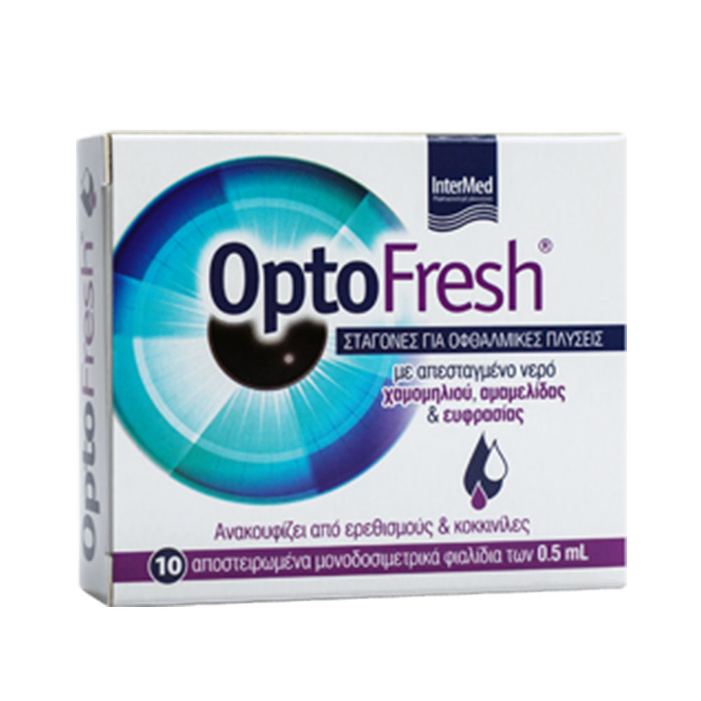 Τα OptoFresh είναι στείρες οφθαλμικές σταγόνες για τον αποτελεσματικό καθαρισμό και τη φυσική ανακούφιση των ξηρών, κουρασμένων & ερεθισμένων οφθαλμών. Με αποσταγμένο νερό χαμομηλιού (για να εκμηδενίζονται οι πιθανότητες αλλεργικών αντιδράσεων), αμαμελίδας και ευφρασίας.