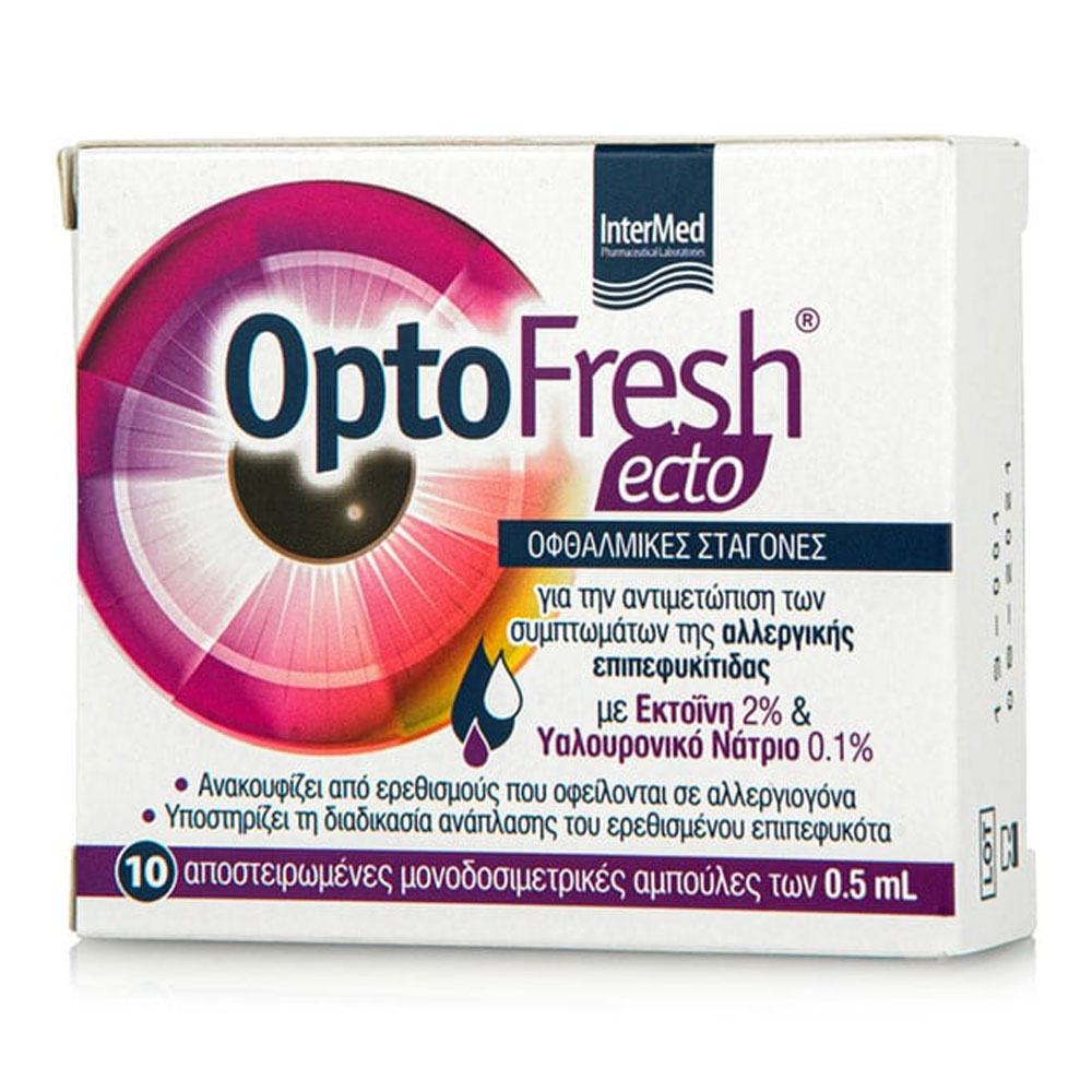 Το OptoFresh ecto είναι στείρο οφθαλμικό διάλυμα, βασισμένο στην εκτοΐνη, το υαλουρονικό νάτριο και την πανθενόλη. Ο μοναδικός συνδυασμός του έχει θετική επίδραση στην αντιμετώπιση των συμπτωμάτων της αλλεργικής επιπεφυκίτιδας καθώς δημιουργεί ένα προστατευτικό φιλμ, το οποίο δρα ως ασπίδα απέναντι στα αλλεργιογόνα και τις ευαισθησίες που αυτά προκαλούν, ενισχύοντας παράλληλα την ενυδάτωση της επιφάνειας του οφθαλμού.