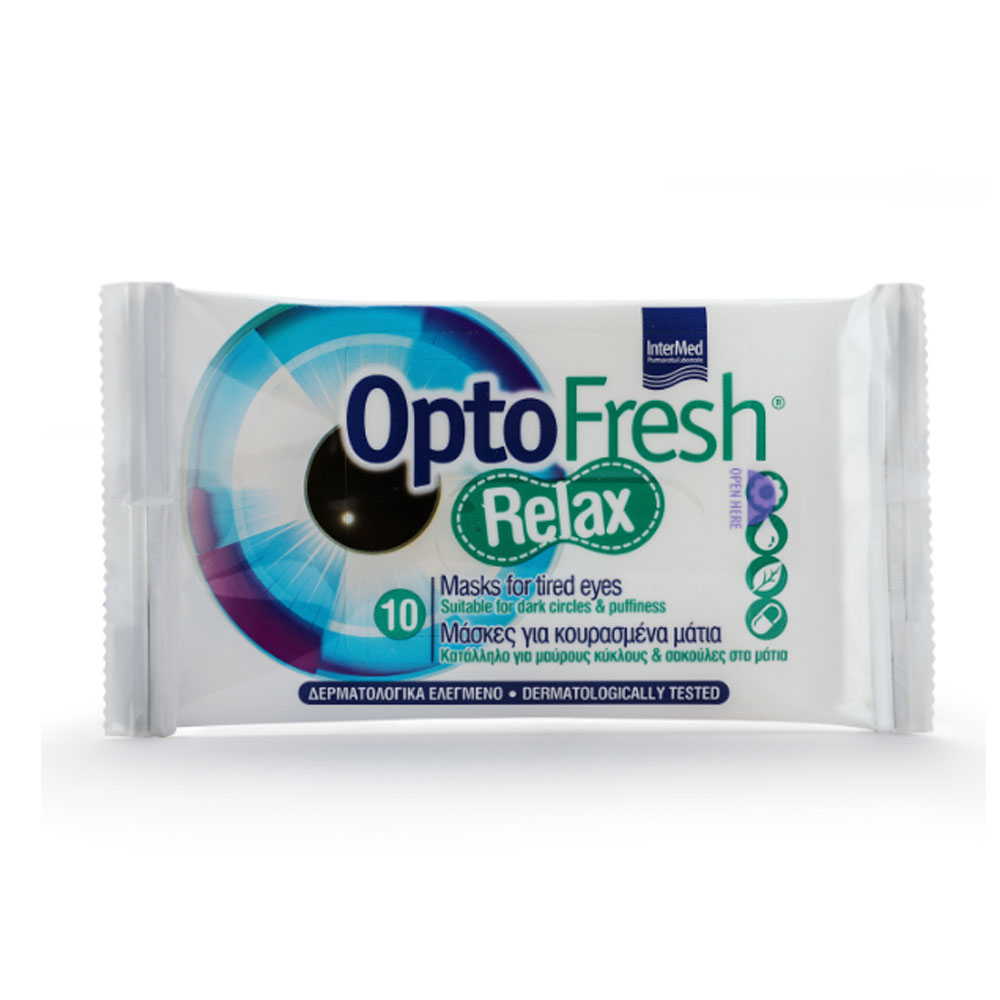 Οι μάσκες OptoFresh Relax είναι ειδικά σχεδιασμένες για τους μαύρους κύκλους και τις σακούλες κάτω από τα μάτια. Περιέχουν υαλουρονικό οξύ, βιταμίνη Ε και φυτικά εκχυλίσματα με ενυδατικές, αντιοξειδωτικές και καταπραϋντικές ιδιότητες, όπως το χαμομήλι, το πράσινο τσάι, η αλόη και το εκχύλισμα μολόχας. Είναι εμπλουτισμένες με εκχύλισμα χρυσού χαμομηλιού, που έχει μελετηθεί για τη δράση ενάντια στις σακούλες και εκχυλίσματα φυκιών, που έχουν μελετηθεί για τη δράση τους κατά των μαύρων κύκλων.