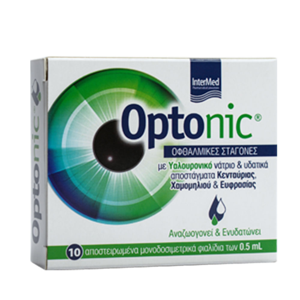 Τα Optonic με κενταύρια, χαμομήλι & υαλουρονικό οξύ (ως υαλουρονικό νάτριο), είναι στείρες οφθαλμικές σταγόνες με υαλουρονικό οξύ, για την αποτελεσματική και παρατεταμένη ενυδάτωση, λίπανση και ανακούφιση των ταλαιπωρημένων λόγω της ξηρότητας οφθαλμών (ξηροφθαλμία).