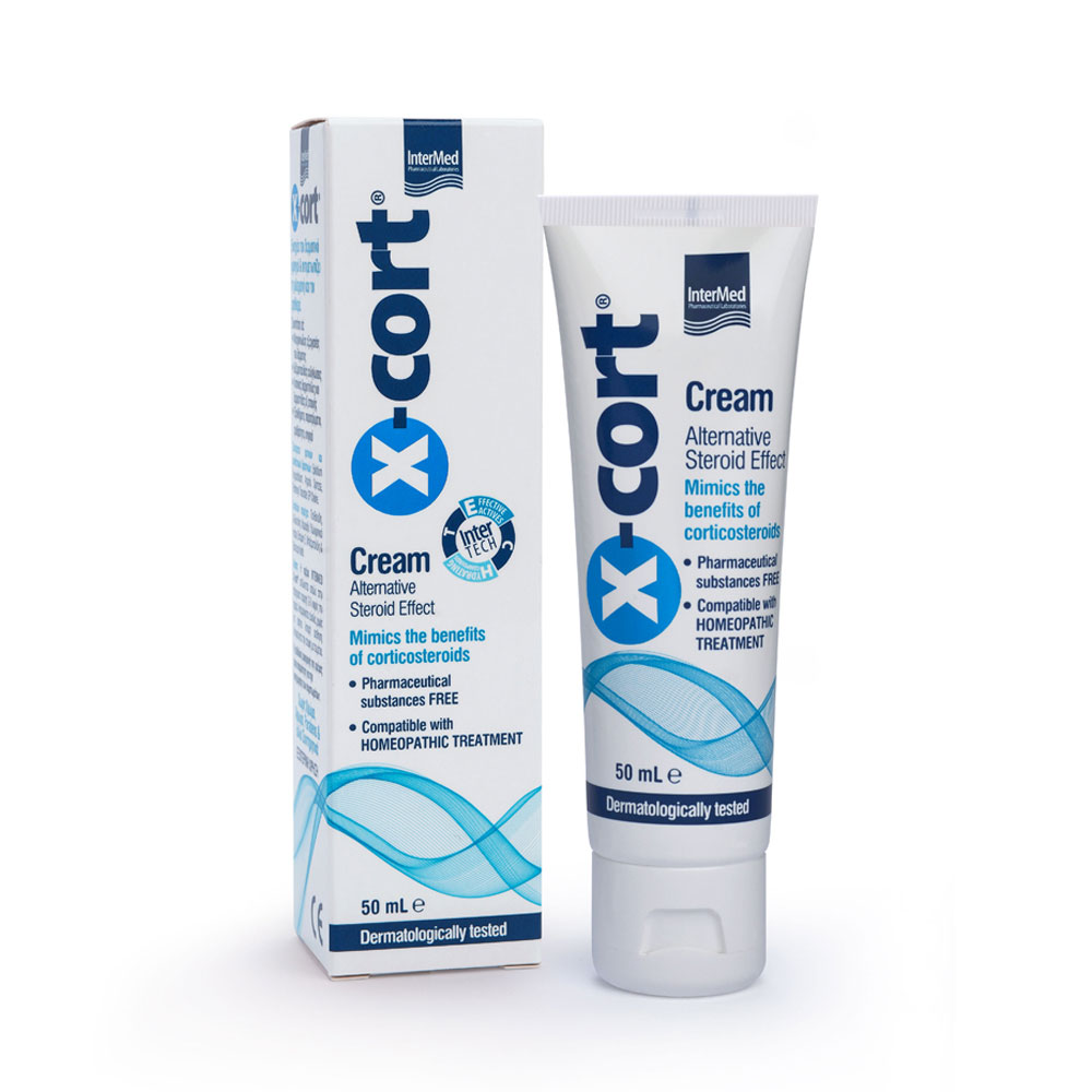 Η INTERMED X-cort® μιμείται τις ιδιότητες των κορτικοειδών, χωρίς τη χρήση φαρμακευτικών ουσιών. Ενισχύει το δερματικό φραγμό, αντιμετωπίζει τη φλεγμονή και τον ερεθισμό και παρέχει ανακούφιση στο δέρμα με έκζεμα, δερματίτιδα, κνησμός, ερυθρότητα, εξανθήματα. Η αντιφλεγμονώδης δράση της οφείλεται στο συνδυασμό των Glycerophosphoinositol choline, Epilobium Angustifolium, Argania Spinosa, Panthenyl Triacetate ενώ η ενίσχυση του υδρολιπιδικού μανδύα επιτυγχάνεται με το συνδυασμό των Argan Oil, Πανθενόλη, Αλλαντοϊνη, Χαμομήλι, Υαλουρονικό νάτριο, Βιταμίνη Ε, Μπιζαμπολόλη & Βούτυρο Karit?.