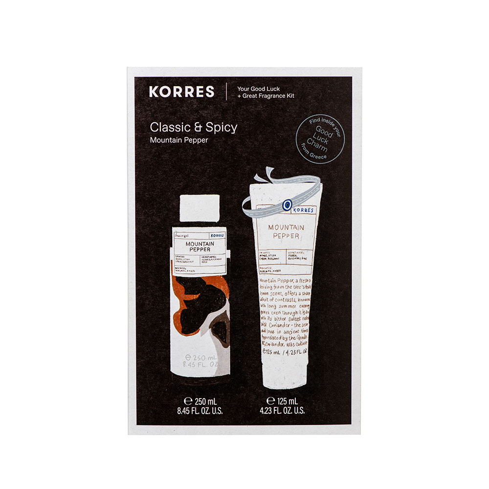 Το σετ Korres Classic & Spicy περιλαμβάνει: Mountain Pepper αφρόλουτρο, γαλάκτωμα για μετά το ξύρισμα και δώρο ένα lucky charm.