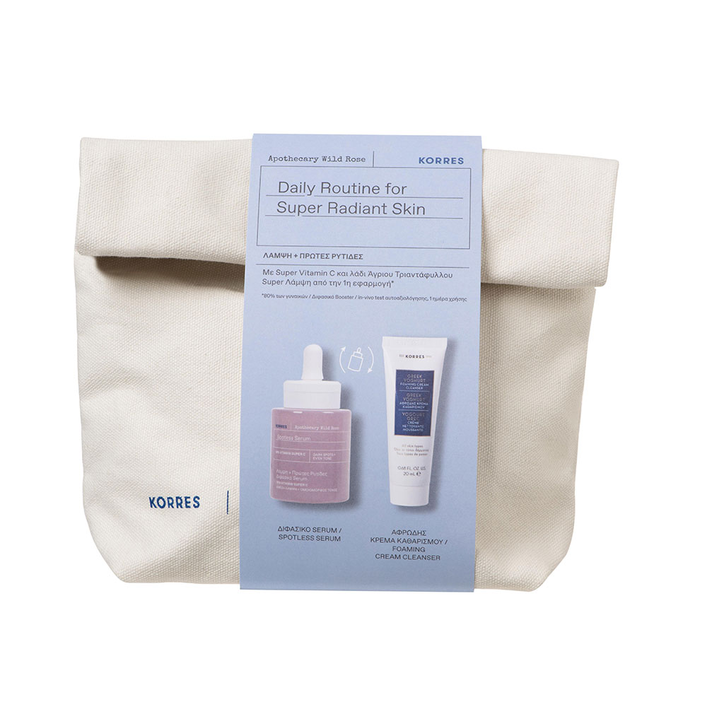 Το Korres Daily Routine for Super Radiant Skin σετ περιέχει: Διφασικό Serum Άγριο Τριαντάφυλλο 30 ml & Ελληνικό Γιαούρτι Αφρώδης Κρέμα Καθαρισμού 20 ml.