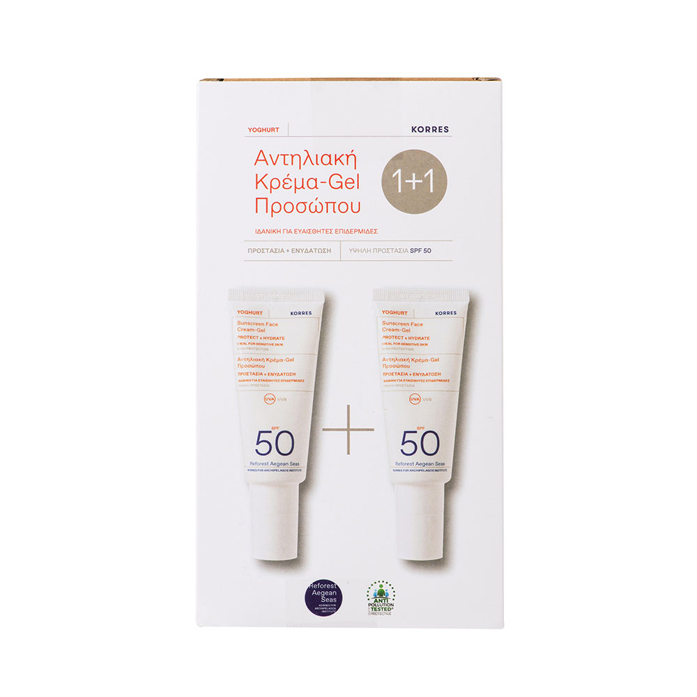 KORRES ΓΙΑΟΥΡΤΙ Αντηλιακή Κρέμα-Gel Προσώπου SPF50 1+1, η αντηλιακή κρέμα-gel προσώπου που προσφέρει ενεργή ενυδάτωση και μοναδική αίσθηση άνεσης. Ενισχυμένη με Γιαούρτι, φυσική πηγή πρωτεϊνών, μία δραστική ουσία που προέρχεται από προϊόν ζύμωσης του φασκόμηλου και πανθενόλη, χαρίζοντας υγιή όψη