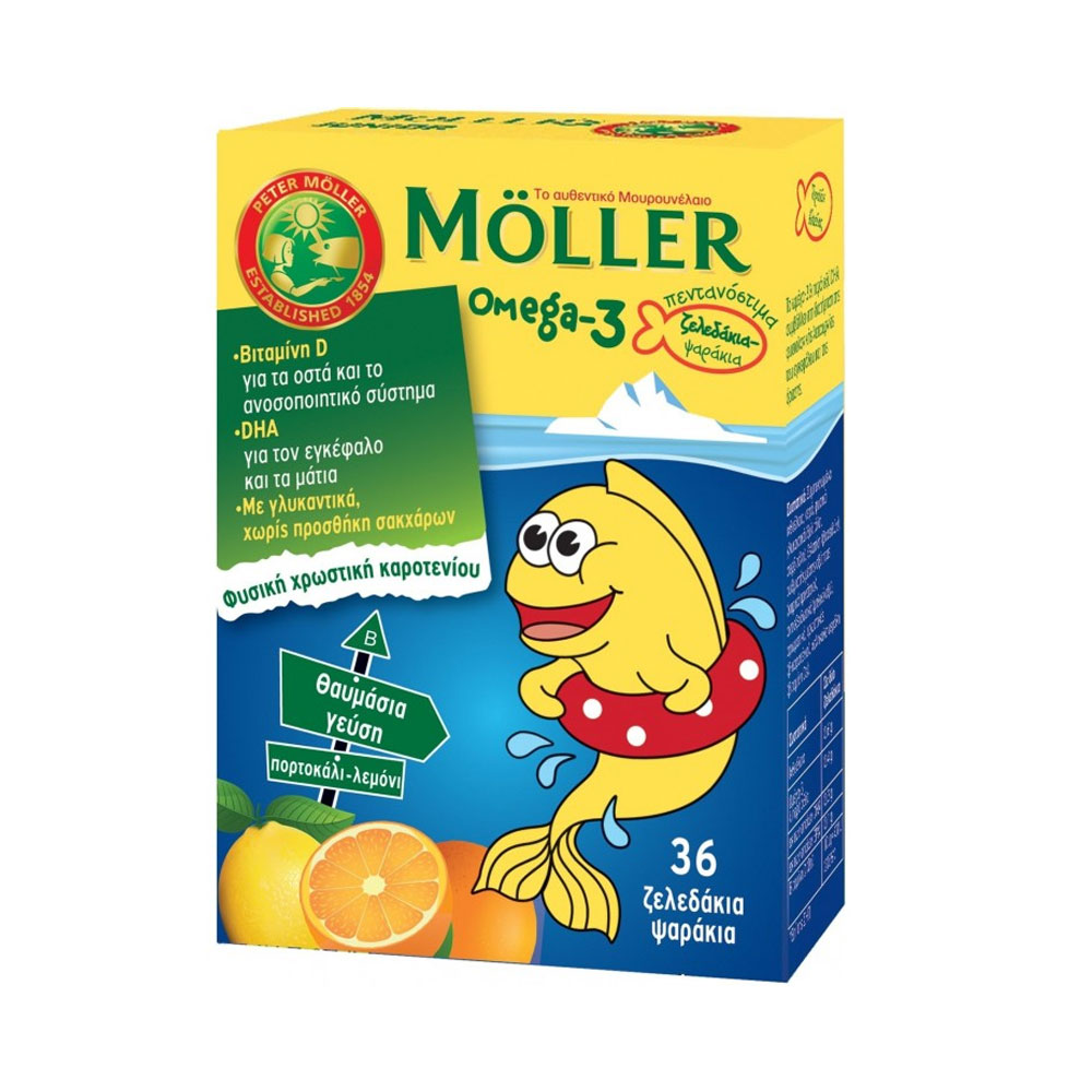 Τα Ψαράκια Ωμέγα-3 Möller’s με ιχθυέλαιο είναι πολύ εύγευστα ζελεδάκια με φυσικά ωμέγα-3 και φυσική βιταμίνη D3, όπως και το μουρουνέλαιο Möller’s! Αποτελούν υγιεινό συμπλήρωμα διατροφής για τα παιδιά που δυσκολεύονται να πάρουν το μουρουνέλαιό τους. Ακόμα και τα πιο δύσκολα παιδιά θα λατρέψουν τα ζελεδάκια MÖLLER’S! Τα Ψαράκια Ωμέγα-3 της Möller’s είναι νοστιμότατα ζελεδάκια πλούσια σε ωμέγα-3 λιπαρά οξέα και φυσική βιταμίνη D. Η βιταμίνη D προάγει την απορρόφηση του ασβεστίου και του φωσφόρου στο σώμα, συμβάλλει στην φυσιολογική ανάπτυξη των οστών στα παιδιά και υποστηρίζει το ανοσοποιητικό σύστημα. Τα ωμέγα-3 λιπαρά οξέα DHA και EPA είναι απολύτως απαραίτητα για την εύρυθμη λειτουργία του οργανισμού. Το DHA συμβάλλει στην καλή λειτουργία του εγκεφάλου και της όρασης.1