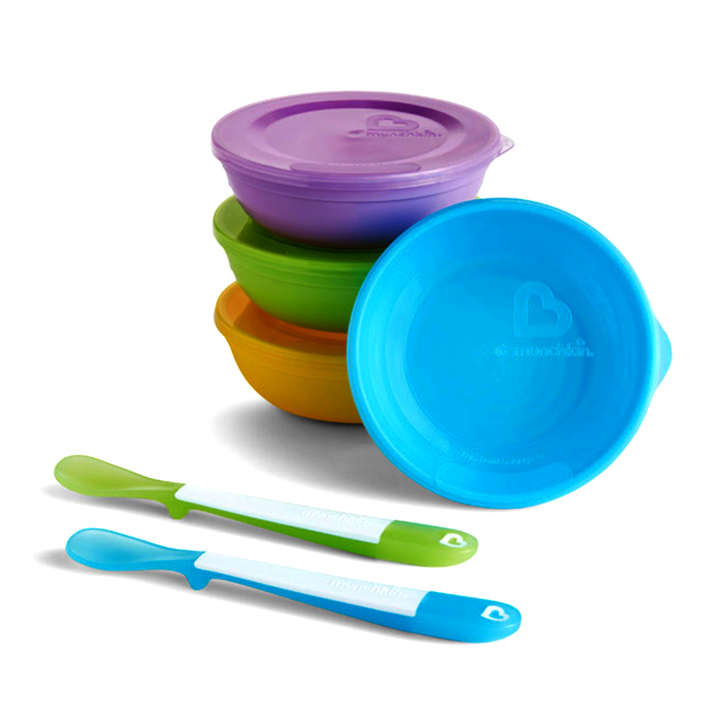Τα Munchkin Love-a-Bowls είναι 100% εγγυημένα ότι είναι αδιάβροχα και στεγανά. Eίναι, επίσης, ασφαλή για χρήση σχεδόν οπουδήποτε, συμπεριλαμβανομένου του φούρνου μικροκυμάτων, του καταψύκτη και του πλυντηρίου πιάτων. Αυτό το σετ τεσσάρων εναλλάξιμων μπολ διαθέτει τέσσερα καπάκια και δύο κουτάλια με μαλακή άκρη, καθιστώντας το το τέλειο ορεκτικό για τις πρώτες ημέρες της στερεάς σίτισης. Ακριβώς κατάλληλα για τα πάντα, από παιδικές τροφές μέχρι σνακ για νήπια, αυτά τα μπολ είναι εύκολα στην αποθήκευση και είναι εύκολο να τα πάρουν οι πολυάσχολες μαμάδες εν κινήσει.