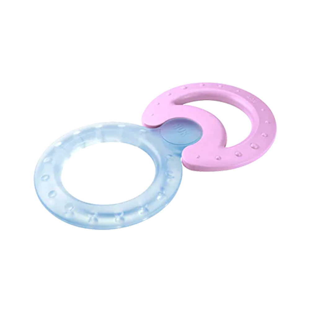 Το σετ δακτυλίων οδοντοφυΐας Cool της NUK βοηθά το μωρό σας με δύο τρόπους: ο δακτύλιος Classic κάνει μασάζ στον ουρανίσκο και στα ούλα, ενώ ο δακτύλιος Cool δροσίζει και ανακουφίζει τα σημεία όπου εντοπίζεται ο πόνος, χωρίς να περιέχει υγρό. Χάρη στο εργονομικό τους σχήμα, οι δακτύλιοι φτάνουν εύκολα σε κάθε σημείο των σιαγόνων. Οι μασητικές κινήσεις διεγείρουν τη ροή του σάλιου, το οποίο με τη σειρά του βοηθά στην πρόληψη της τερηδόνας. Η ανάγλυφη επιφάνεια οξύνει την αίσθηση της αφής, ενώ η δυνατότητα συναρμολόγησης παρακινεί το μωρό να παίξει.
