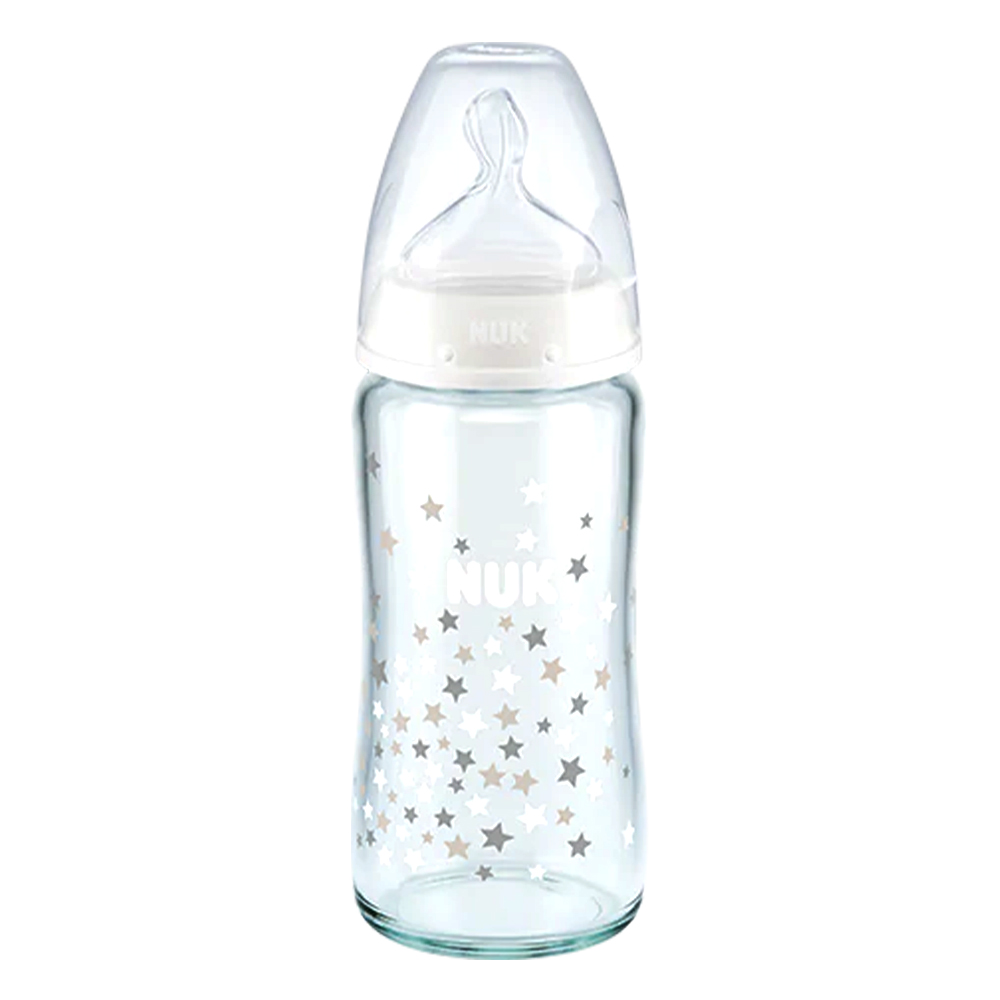 Γυάλινο μπιμπερό NUK First Choice+ με Δείκτη Ελέγχου Θερμοκρασίας και θηλή σιλικόνης. Χωρητικότητα 240ml. Για μωρά 0-6 μηνών.