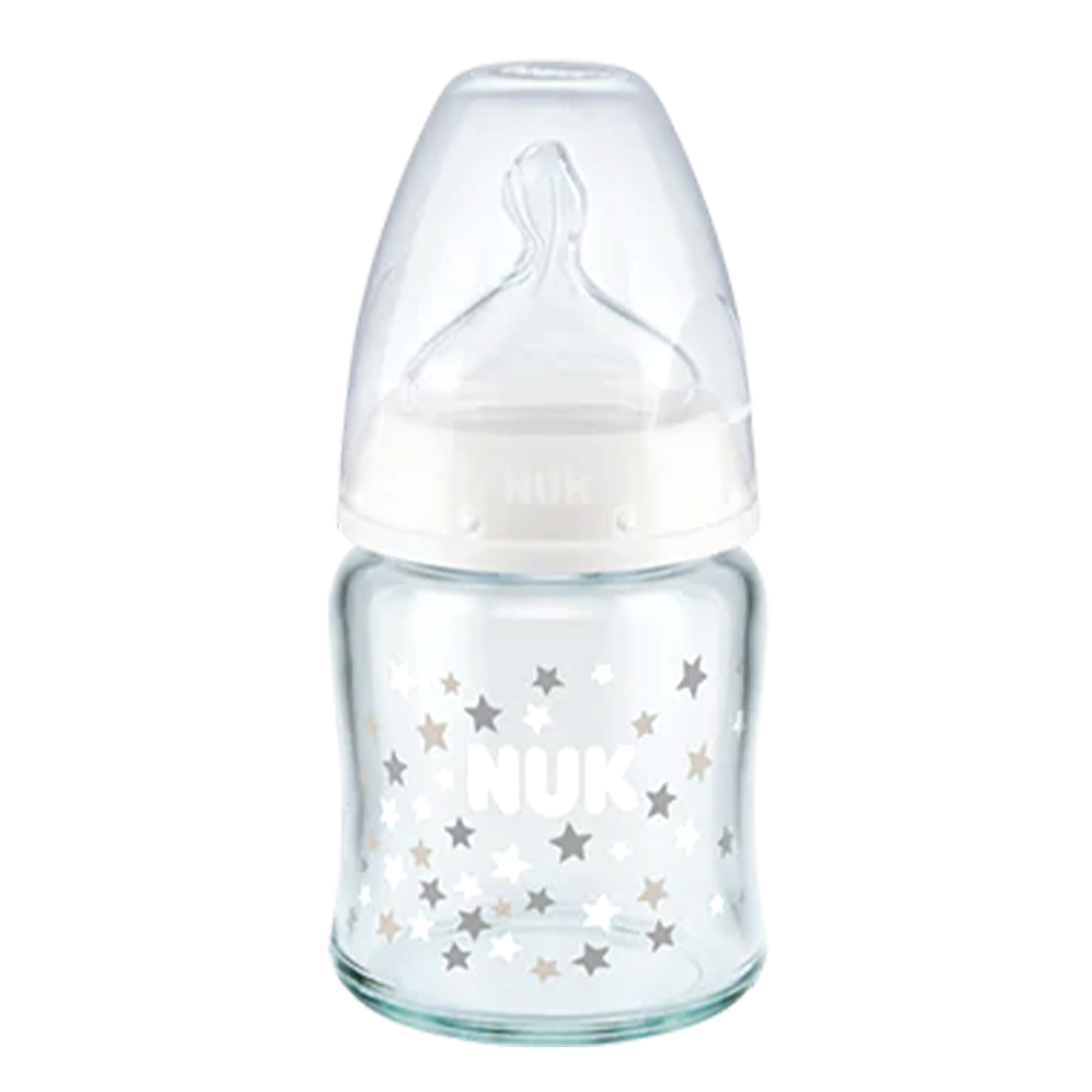 Γυάλινο μπιμπερό NUK First Choice+ με Δείκτη Ελέγχου Θερμοκρασίας και θηλή σιλικόνης. Χωρητικότητα 150ml. Για μωρά 0-6 μηνών.