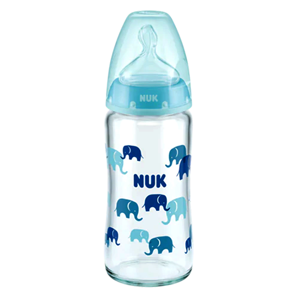 Γυάλινο μπιμπερό NUK First Choice+ με Δείκτη Ελέγχου Θερμοκρασίας και θηλή σιλικόνης. Χωρητικότητα 240ml. Για μωρά 0-6 μηνών.