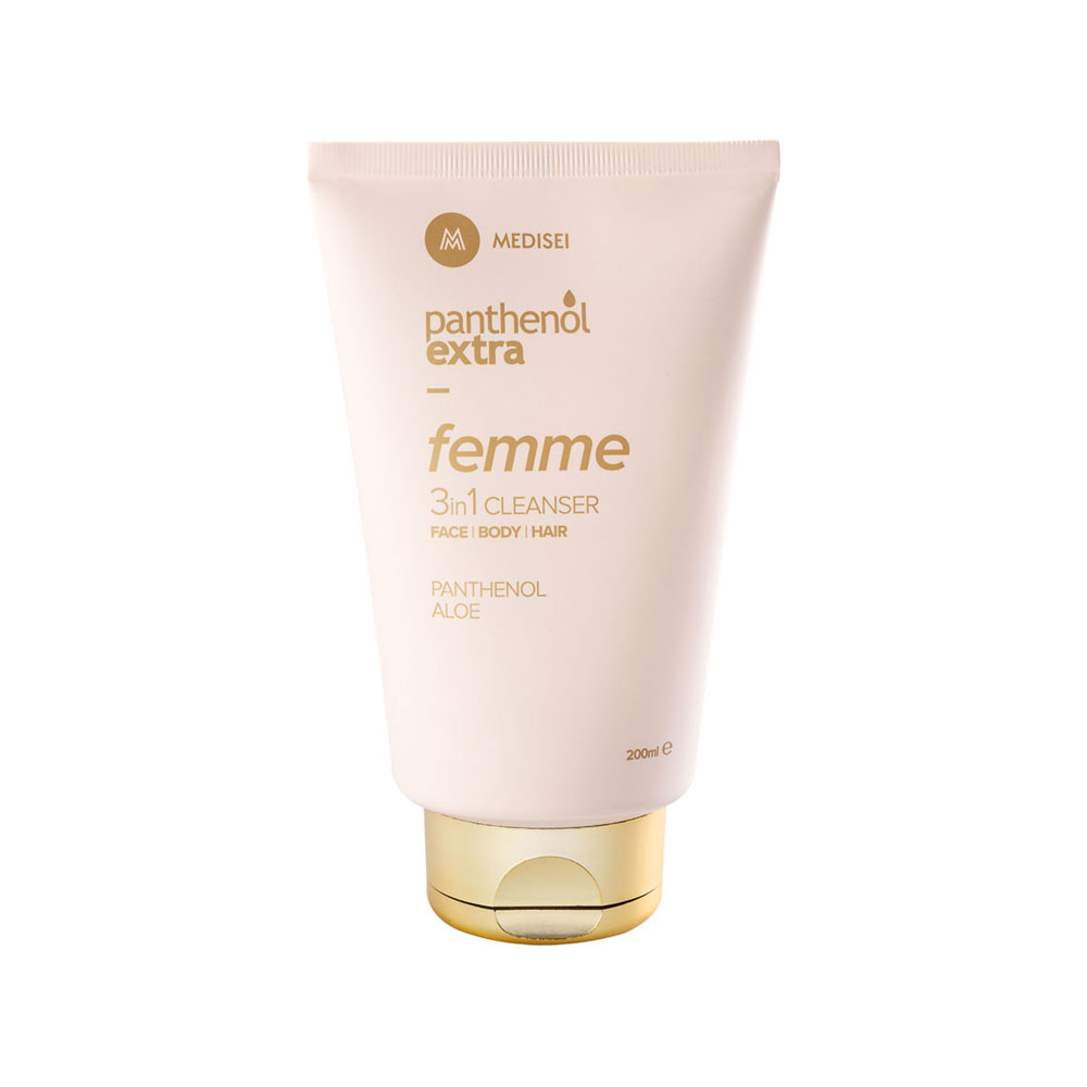 Το Panthenol Extra Femme 3 in 1 Cleanser καθαρίζει αποτελεσματικά πρόσωπο, σώμα και μαλλιά. Αιθέριο άρωμα ανατολής και νότες από βανίλια, περγαμόντο και κεδρόξυλο.