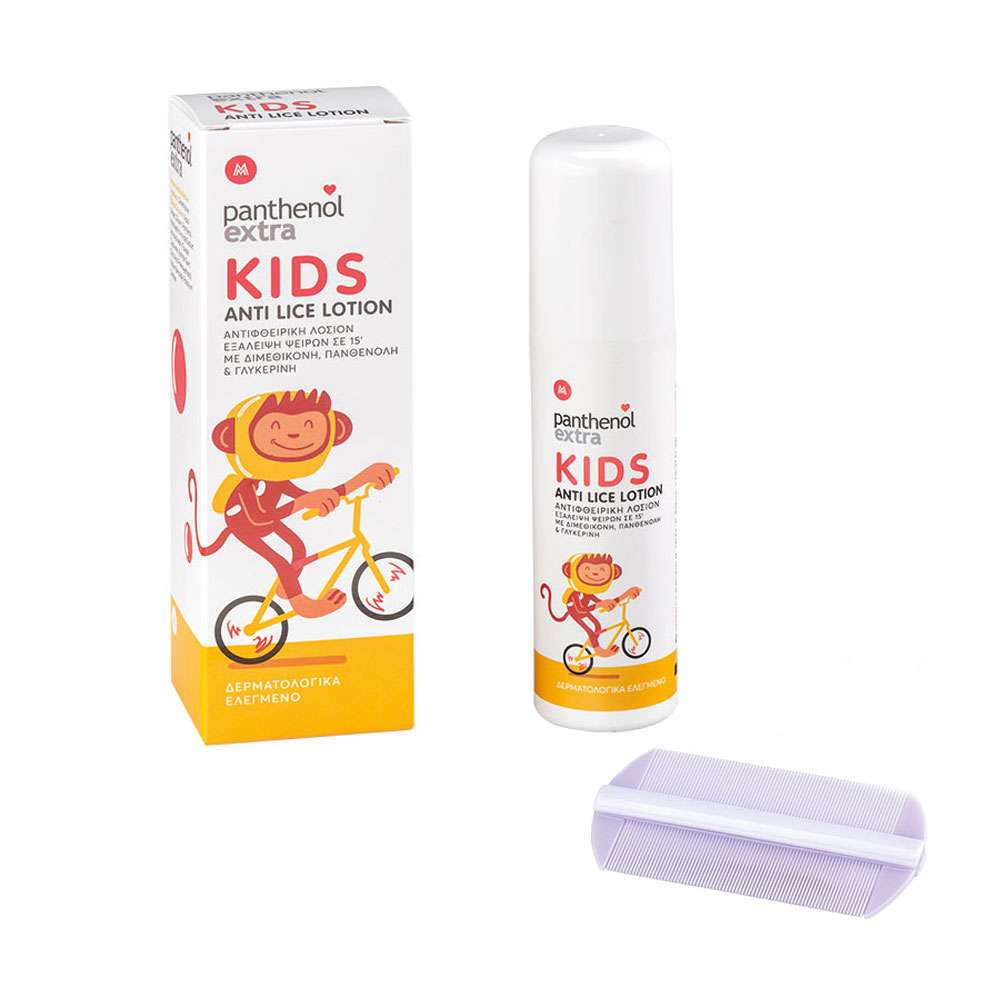 Η Αντιφθειρική Λοσιόν Panthenol Extra Kids αντιμετωπίζει αποτελεσματικά ψείρες και κόνιδες σε λίγα μόνο λεπτά. Είναι βασισμένη στη Διμεθικόνη και δεν περιέχει επιβλαβή εντομοκτόνα. Η Διμεθικόνη δρα με μηχανικό τρόπο και, βάσει της κλινικά αποδεδειγμένης δράσης της, εξοντώνει τις ψείρες προκαλώντας τους ασφυξία. Η Panthenol Extra Kids Anti Lice Lotion είναι εμπλουτισμένη με Πανθενόλη και Γλυκερίνη, για ταυτόχρονη ενυδάτωση και περιποίηση των μαλλιών και του τριχωτού της κεφαλής. Στη συσκευασία περιλαμβάνεται το ειδικό χτενάκι για τον καθαρισμό των μαλλιών μετά την εφαρμογή της λοσιόν και εύκολη απομάκρυνση της κόνιδας. Συνδυάζεται με το Panthenol Extra Kids Shampoo για ολοκληρωμένη αγωγή και καθαρά μαλλιά όλο τον χρόνο.