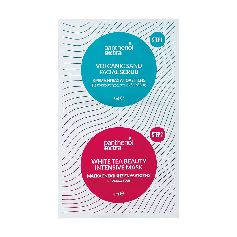Περιποίηση σε δύο βήματα. Βήμα 1ο: Απολέπιση προσώπου και βαθύς καθαρισμός με το Panthenol extra Volcanic Sand Facial Scrub. Βήμα 2ο: Ενυδάτωση με την Panthenol extra White Tea Beauty Intensive Mask