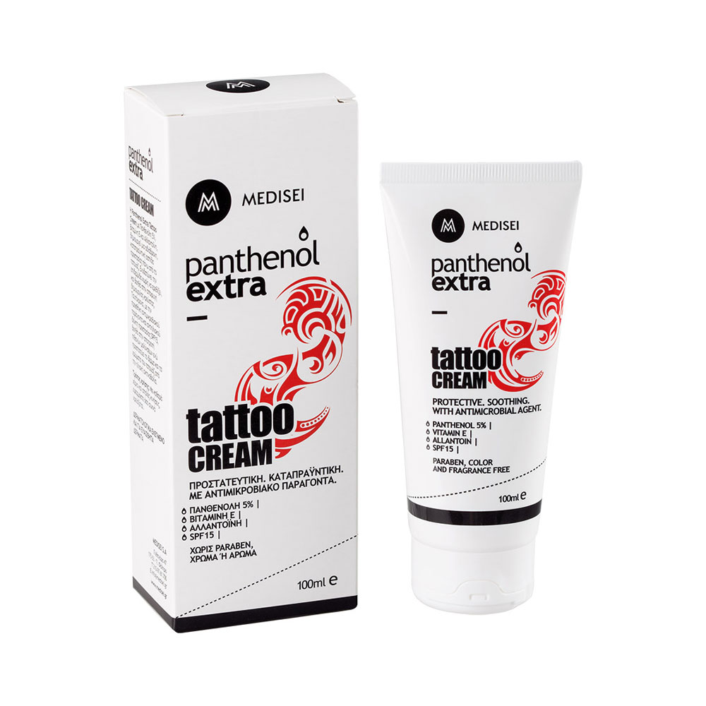 Με πανθενόλη, αλλαντοϊνη και βιταμίνη Ε ενυδατώνει την επιδερμίδα, χωρίς να ερεθίζει και ταυτόχρονα βοηθά στην αποφυγή δημιουργίας κρούστας. Επίσης, με την προσθήκη αντιμικροβιακού παράγοντα και αντιηλιακού δείκτη προστασίας SPF15, βοηθά στην αποτροπή πιθανών μολύνσεων ενώ προστατεύει το δέρμα και τα χρώματα του τατουάζ από την ηλιακή ακτινοβολία. Η Panthenol Extra Tattoo Cream με αντιμικροβιακό παράγοντα είναι η προστατευτική, καταπραϋντική κρέμα για το τατουάζ σας.