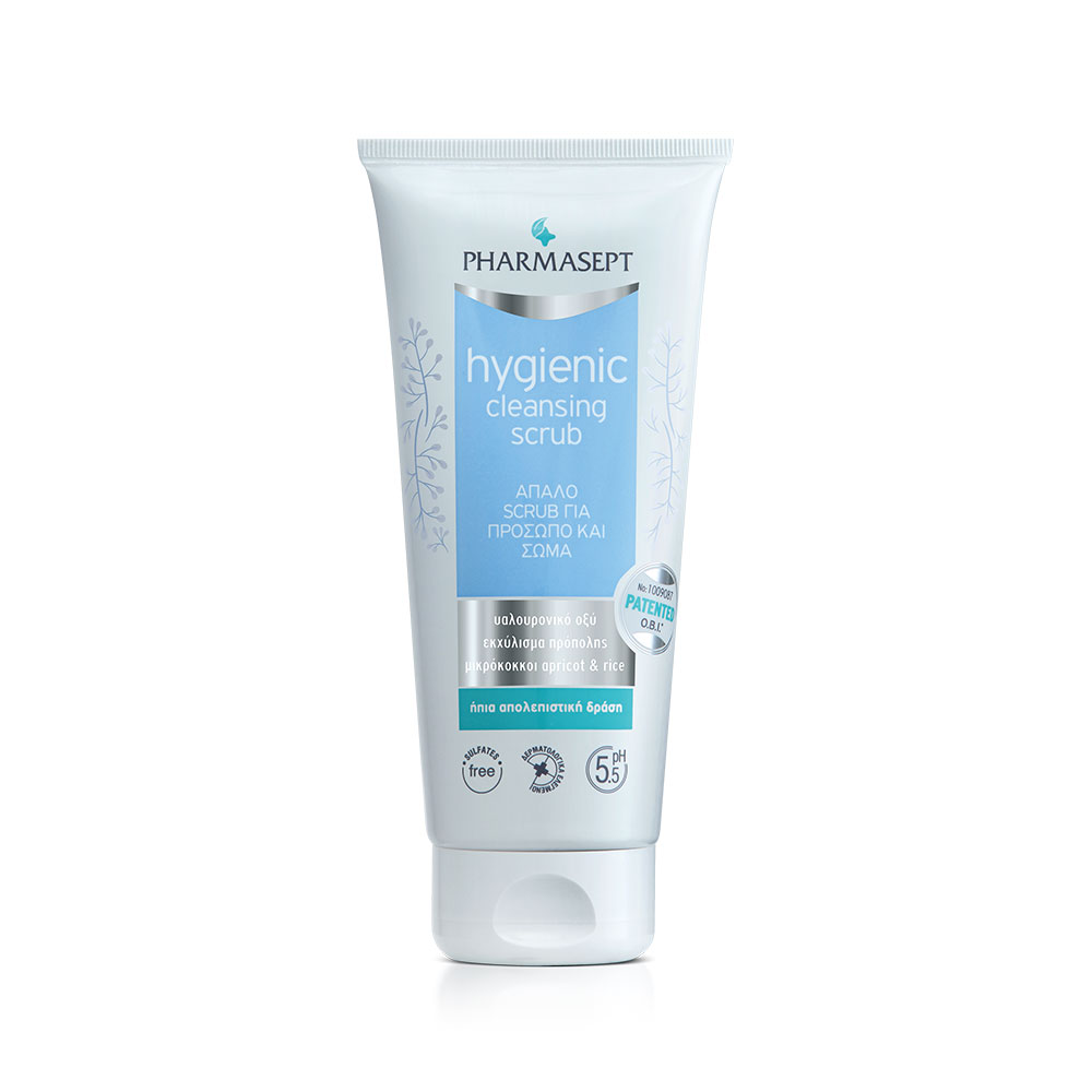 Απαλό scrub απολέπισης και καθαρισμού για πρόσωπο και σώμα, εμπλουτισμένο με το πατενταρισμένο σύστημα καθαρισμού της Pharmasept.