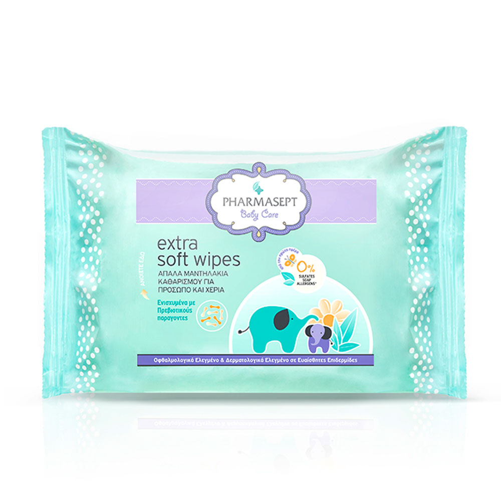 Aπαλά βιοδιασπώμενα μαντηλάκια με 100% βισκόζη και χωρίς πλαστικό, ενισχυμένα με πρεβιοτικούς παράγοντες που ενισχύουν το δερματικό μικροβίωμα των βρεφών, κατάλληλα για τον καθαρισμό του προσώπου και των χεριών.