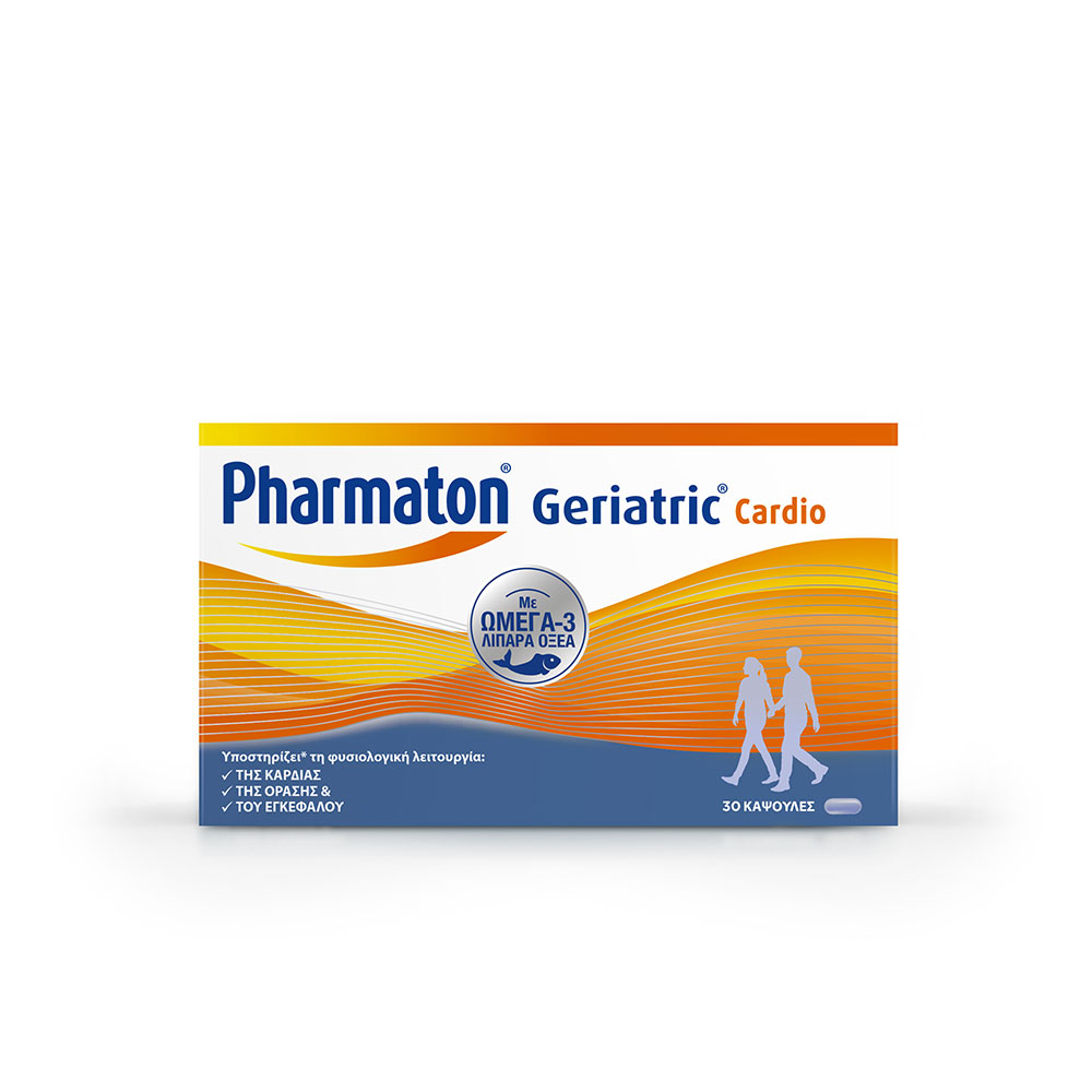 Pharmaton® Geriatric® Cardio με ΩΜΕΓΑ-3 ΛΙΠΑΡΑ ΟΞΕΑ, βιταμίνες και μέταλλα, συστατικά που συμβάλλουν στη φυσιολογική λειτουργία της καρδιάς*, του εγκεφάλου* και της όρασης*. Επιπρόσθετα, υποστηρίζουν τη φυσιολογική γνωσιακή λειτουργία (όπως μνήμη και συγκέντρωση), συμβάλλουν στη μείωση της κόπωσης & στη φυσιολογική λειτουργία του ανοσοποιητικού.