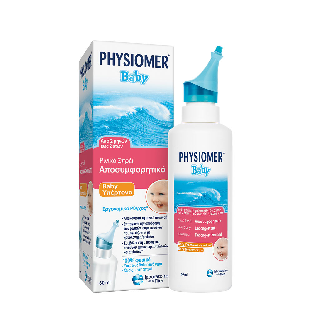 Το μωρό σας υποφέρει από κρυολόγημα και δυσκολεύεται στην αναπνοή και στο φαγητό; To PHYSIOMER® Baby Υπέρτονο είναι ένα φυσικό αποσυμφορητικόσπρέι που βοηθάει αποτελεσματικά στον καθαρισμό των ρινικών διόδων και συμβάλλει στην αποκατάσταση της αναπνοής, ενώ ταυτόχρονα παρέχει ανακούφιση και προσφέρει ευεξία κατά τη διάρκεια του ύπνου και του φαγητού. Με 100% θαλασσινό νερό, πλούσιο σε μεταλλικά άλατα, το PHYSIOMER® Baby Υπέρτονο ανακουφίζει το βρέφος από τη ρινική συμφόρηση που οφείλεται σε κρυολόγημα, ρινίτιδα ή ρινοφαρυγγίτιδα, μειώνει την ένταση και τη διάρκεια των ρινικών συμπτωμάτων και συμβάλλει στην πρόληψη εμφάνισης ΩΡΛ επιπλοκών όπως η ωτίτιδα και η βρογχιολίτιδα. To PHYSIOMER® Baby Υπέρτονοείναι ειδικά προσαρμοσμένο για να καθαρίζει απαλά την ευαίσθητη μυτούλα του μωρού σας χάρη στο μαλακό του ρύγχος (comfort tip) και τον εξαιρετικά ήπιο ψεκασμό (microdiffusion) χωρίς προωθητικά αέρια.