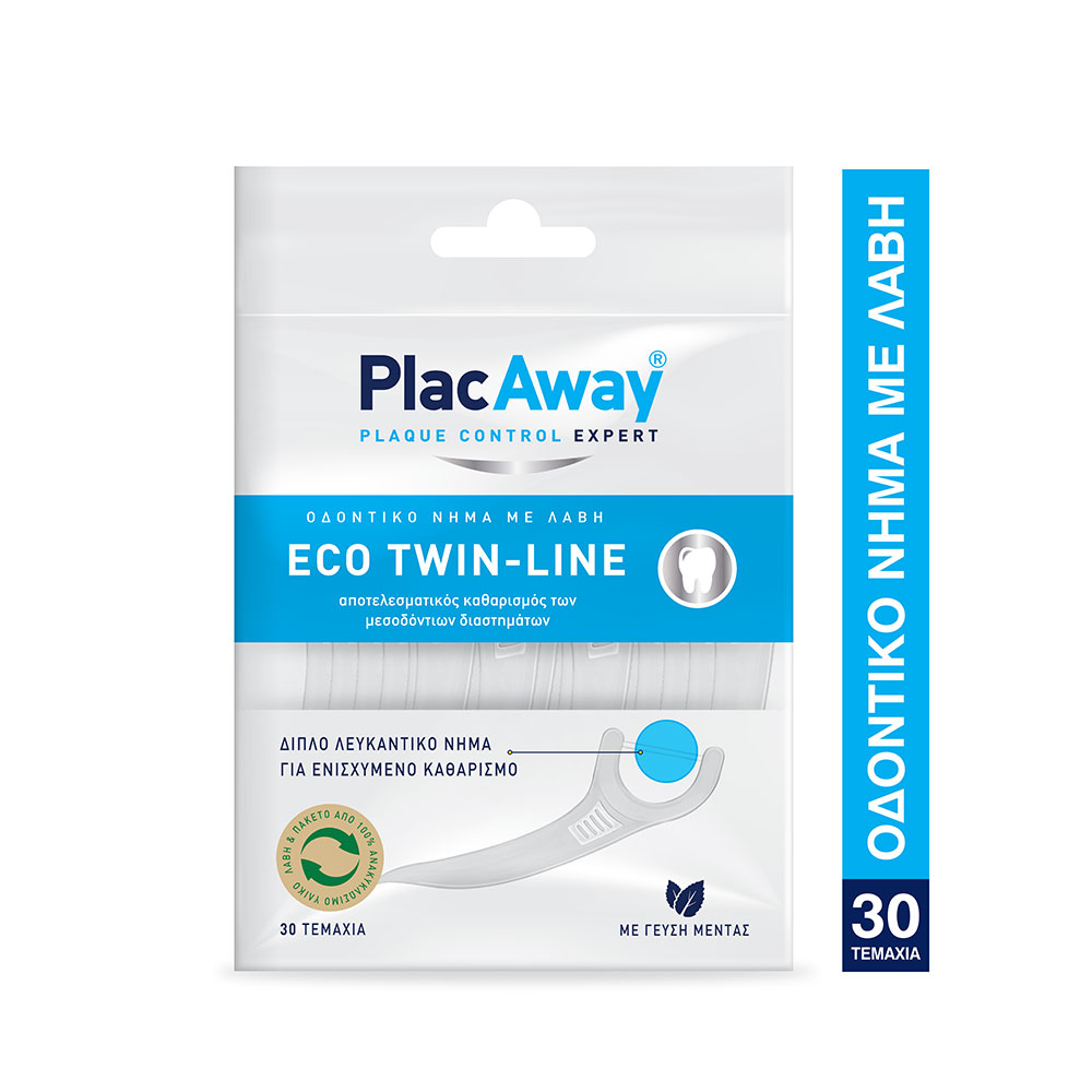 Νέο Plac Away Twin Line Διπλό οδοντικό νήμα με λαβή για αποτελεσματικό καθαρισμό των μεσοδόντιων διαστημάτων. Αφαιρεί την πλάκα, καθαρίζει αποτελεσματικά. Για καθαρά χαμόγελα εύκολα, πάντα & παντού. Βολικό για χρήση ‘on the go’ σε συσκευασία που ξανακλείνει.
