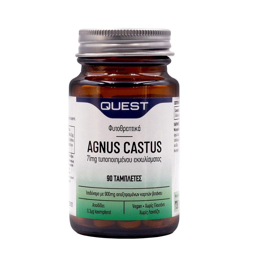 Το Agnus Castus της Quest περιέχει τυποποιημένο εκχύλισμα καρπών Agnus castus, το οποίο ισοδυναμεί με 900mg αποξηραμένων καρπών του βοτάνου και αποδίδει 0,3μg καμφερόλης, που είναι δραστικό συστατικό αυτού του παραδοσιακά χρησιμοποιούμενου βοτάνου.