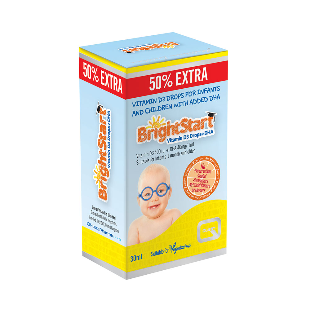 Το συμπλήρωμα διατροφής Bright Start της Quest είναι ένα εξειδικευμένο προϊόν για βρέφη και παιδιά που συνδυάζει δύο πολύτιμα συστατικά, τη βιταμίνη D και το ωμέγα 3 απαραίτητο λιπαρό οξύ DHA.