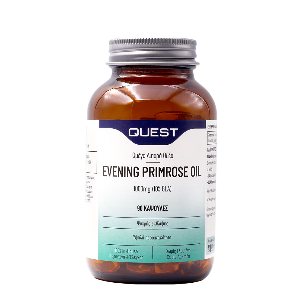 Το συμπλήρωμα διατροφής Evening Primrose 1000mg της Quest περιέχει έλαιο νυχτολούλουδου, το οποίο είναι μια πλούσια πηγή του ωμέγα 6 λιπαρού οξέος GLA (γάμμα λινολενικό οξύ).