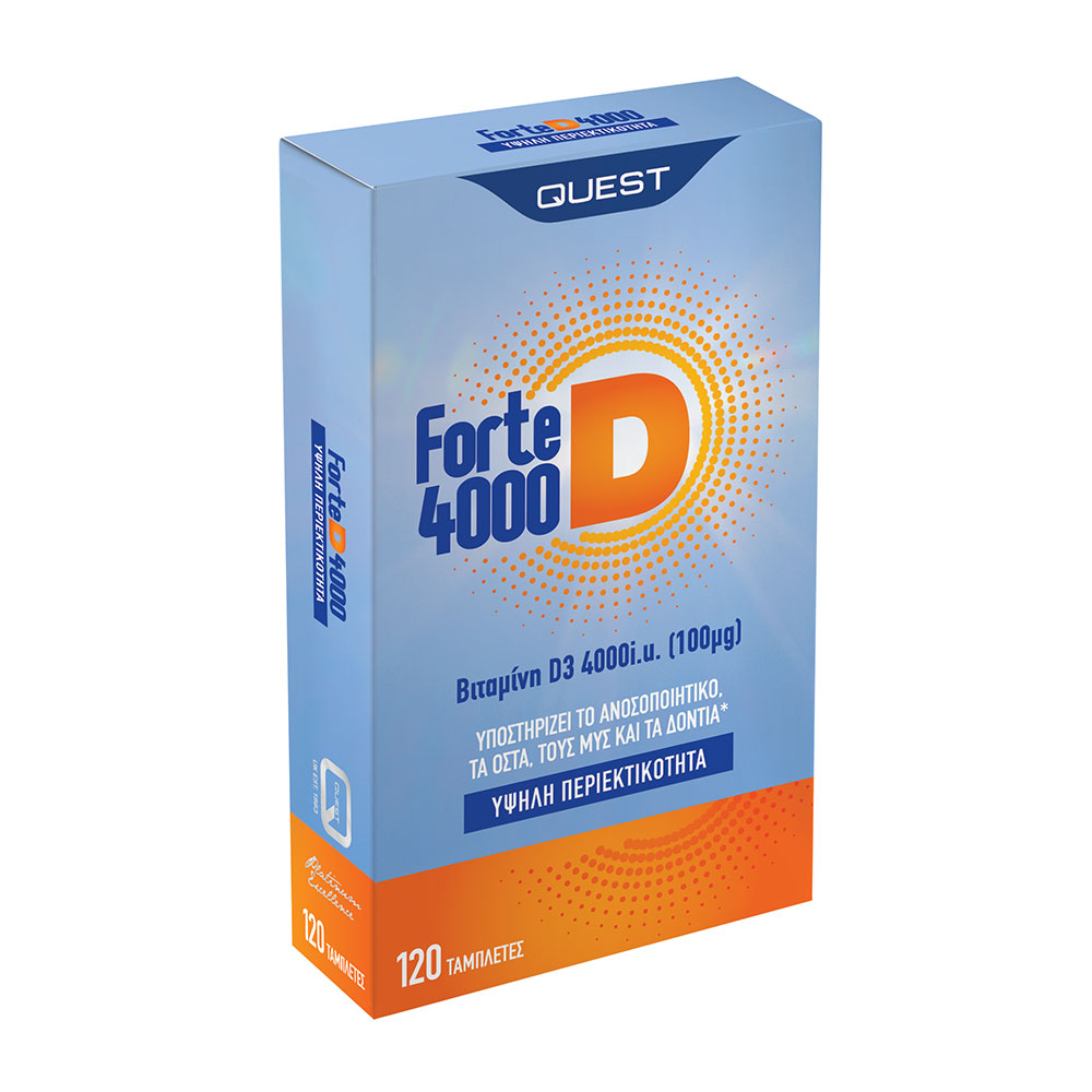 Το Forte D 4000 της Quest, με 4000i.u. (100μg) βιταμίνη D, συμβάλλει στην απορρόφηση του ασβεστίου, στην καλή κατάσταση των οστών και των δοντιών και στην καλή λειτουργία των μυών και του ανοσοποιητικού συστήματος.