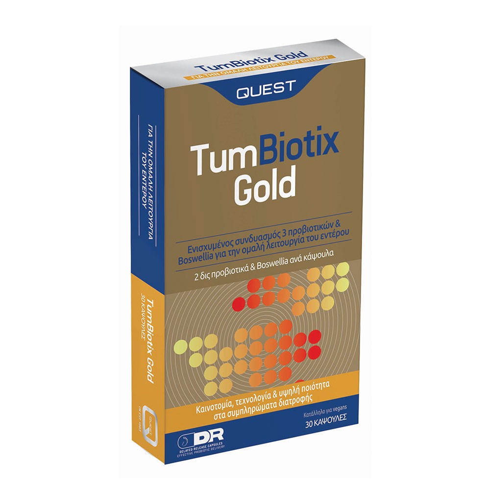 Το TumBiotixTM Gold περιέχει έναν δραστικό συνδυασμό Casperome® και τριών προβιοτικών γαλακτικών βακτηρίων, των L.plantarum, L.acidophilus & L.rhamnosus, τα οποία βοηθούν στην καλή λειτουργία του εντέρου. Πρόκειται για μία στοχευμένη σύνθεση προβιοτικών και φυτικών εκχυλισμάτων που έχει σχεδιαστεί για να παρέχει συμπτωματική ανακούφιση σε όσους πάσχουν από σύνδρομο ευερέθιστου εντέρου ή από φλεγμονώδεις παθήσεις του εντέρου. Τόσο το σύνδρομο ευερέθιστου εντέρου όσο και οι φλεγμονώδεις παθήσεις του εντέρου, συνδέονται με ανισορροπίες στη μικροχλωρίδα του εντέρου. Τα προβιοτικά προσφέρουν συμπτωματική ανακούφιση στο κοιλιακό άλγος, το φούσκωμα, τον μετεωρισμό και τις ακανόνιστες συνήθειες του εντέρου όπως η εναλλασσόμενη διάρροια ή δυσκοιλιότητα. Το Casperome® είναι μια κλινικά μελετημένη φόρμουλα boswellia serrata, με βάση τη λεκιθίνη. Μελέτες για τη Boswellia δείχνουν ότι τα τριτερπενοειδή οξέα της βοηθούν στη μείωση των φλεγμονών στο έντερο και βελτιώνουν τα συμπτώματα των παθήσεων του εντέρου.