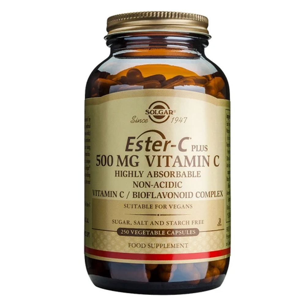 Σύμπλεγμα υψηλής απορρόφησης, buffered βιταμίνης C με ενσωματωμένα: σύμπλεγμα κιτρικών βιοφλαβονοειδών, acerola, καρπούς αγριοτριανταφυλλιάς, ρουτίνη και τους φυσικά ευρισκομένους μεταβολίτες της βιταμίνης C: L-θρεονικό, L-λυξονικό και L-ξυλονικό οξύ. H Ester – C 500mg της Solgar είναι μία πρωτοποριακή μορφή βιταμίνης C, η οποία απορροφάται τέσσερις φορές περισσότερο, ενεργοποιείται δύο φορές γρηγορότερα και παραμένει στην κυκλοφορία δύο φορές περισσότερο σε σχέση με την κανονική βιταμίνη C.